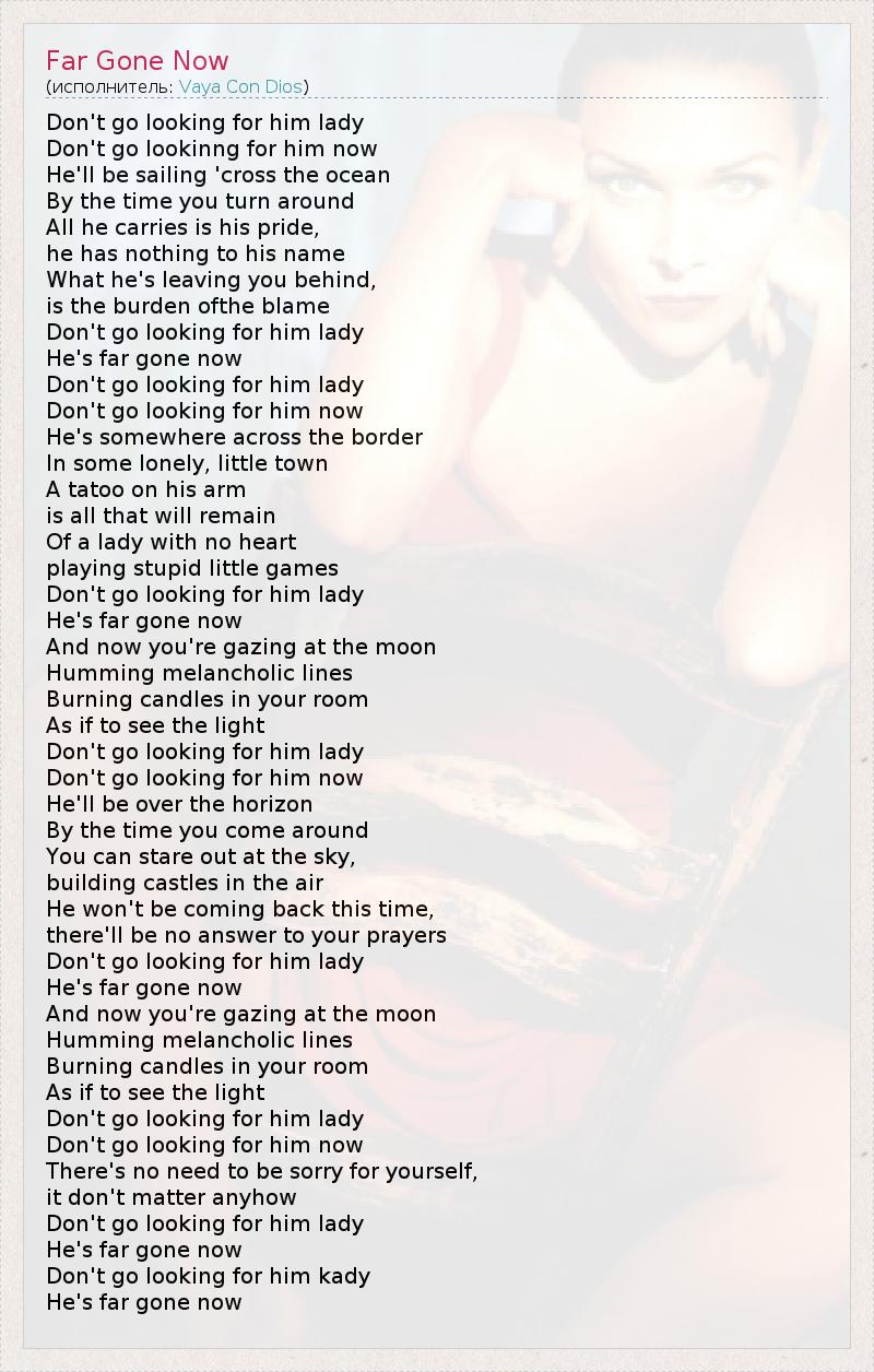 Don't go looking for him lady Don't go lookinng for him now He'll be sailing 'cross the ocean By the time you turn around All he carries is his pride, he has nothing to his name What he's leaving you behind, is the burden ofthe blame Don't go looking for him lady He's far gone now Don't go looking for him lady Don't go looking for him now He's somewhere across the border In some lonely, little town A tatoo on his arm is all that will remain Of a lady with no heart playing stupid little games Don't go looking for him lady He's far gone now And now you're gazing at the moon Humming melancholic lines Burning candles in your room As if to see the light Don't go looking for him lady Don't go looking for him now He'll be over the horizon By the time you come around You can stare out at the sky, building castles in the air He won't be coming back this time, there'll be no answer to your prayers Don't go looking for him lady He's far gone now And now you're gazing at the moon Humming melancholic lines Burning candles in your room As if to see the light Don't go looking for him lady Don't go looking for him now There's no need to be sorry for yourself, it don't matter anyhow Don't go looking for him lady He's far gone now Don't go looking for him kady He's far gone now