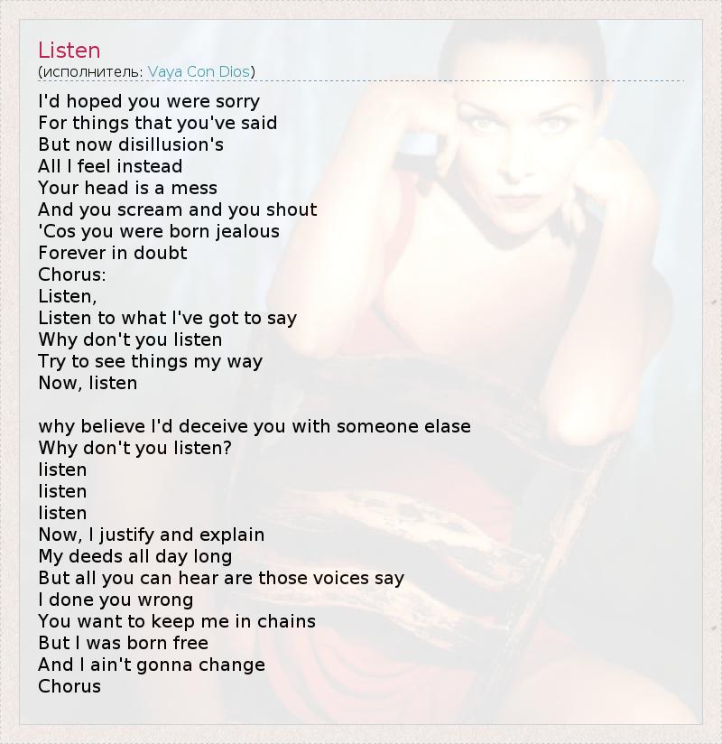Я надеялся, что ты сожалели Для вещей, которые вы сказали Но теперь разочаровывать -х Все, что я чувствую, а не Твоя голова беспорядок И ты кричишь и кричишь Потому вы родились ревновать Навсегда в сомнении Припев: Слушай, Послушайте, что я должен сказать, Почему бы вам не слушать Постарайтесь, чтобы увидеть вещи мой путь Теперь слушайте Поэтому считаю, что я вас обманывать с кем elase Почему бы вам не слушать ? слушать слушать слушать Теперь , я оправдать и объяснить Мои поступки в течение всего дня Но все, что вы можете услышать, эти голоса говорят Я сделал , что вы неправильно Вы хотите , чтобы держать меня в цепях Но я родился бесплатно И я не собираюсь менять Припев