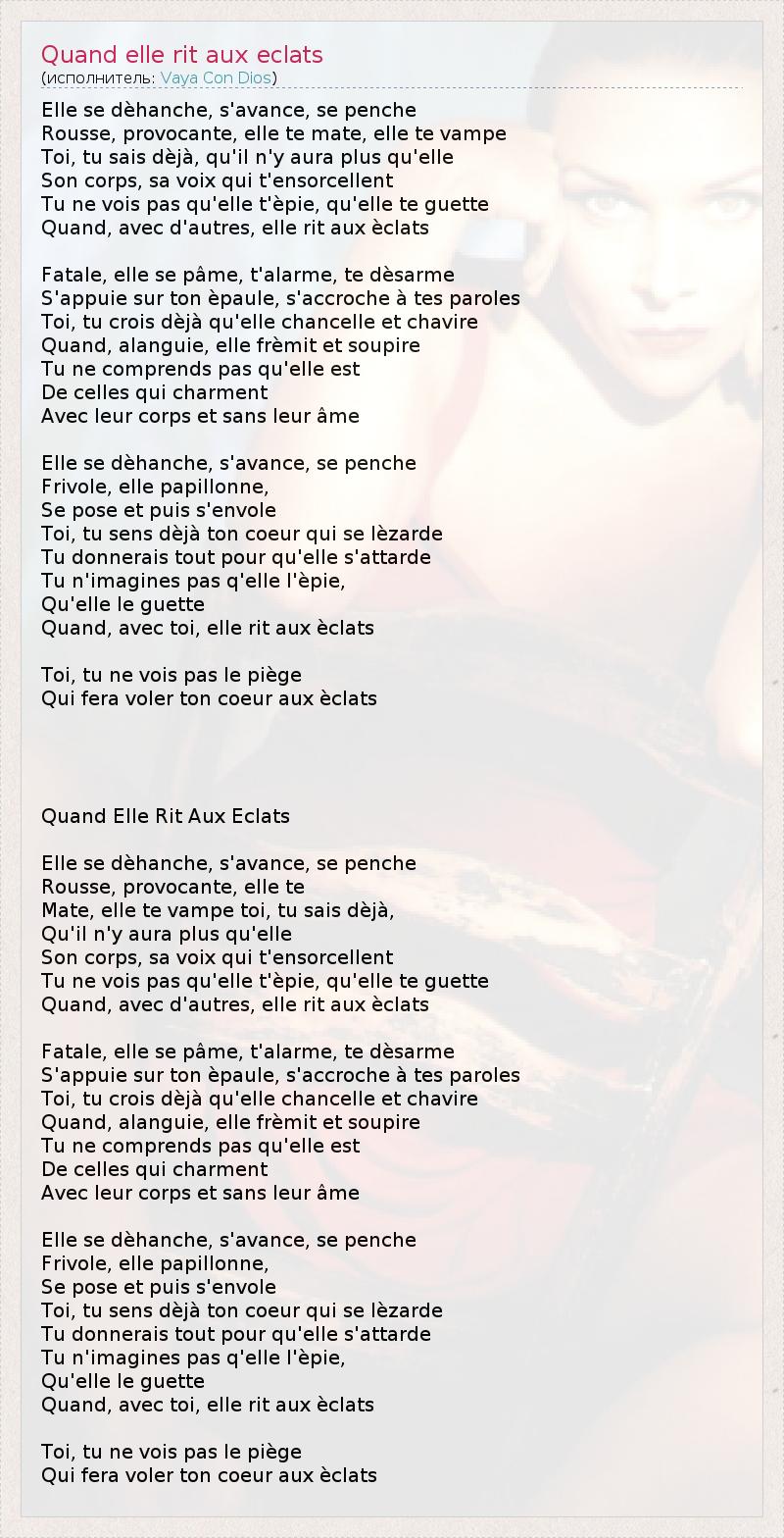 ...она, словно птица, летает, кружится, она, словно праздник, и манит, и дразнит, и твоя мечта, её гибкое тело, оно с ума свести сумело, ты мечтой согрет, лишь она в мире целом, а смех её, как яркий свет, она и тревожит, и сложно, быть может, кипит жизни сила, и разум смутила, и твоя мечта в небеса улетела, она всегда летает смело, и приятен вид очень нежного тела, но красоту душа таит, она, словно птица, летает, кружится, легко всё разрушит, и ты ей не нужен, а твоя мечта только место пустое, ты думал, что она с тобою, ты отдал бы всё, всё, что есть за душою, но смех её погас, как свет, всё, всё мираж в этом мире, зато душа, как яркий свет... *Вольный перевод и попытка осилить ритм оригинального текста. Когда она смеется до слез (перевод Julie P из СПб) Она идет, покачивая бедрами, наклоняется, Рыжеволосая провокаторша, она наблюдает За тобой, соблазняет тебя, и ты уже понимаешь, Что кроме нее никого не будет, Ее тело, ее голос околдовывают тебя, Ты видишь лишь, как она приглядывается, Подстерегает тебя, когда хохочет с другими Роковая женщина, она лишается чувств, пугает тебя, Обезоруживает, опирается на твое плечо, Цепляется к твоим словам, а ты уже веришь, что Она в нерешительности и взволнована, Когда она дрожит и томно вздыхает, Ты не понимаешь, что она из тех, кто чаруют Лишь телом, не вкладывая в это души Она идет, покачивая бедрами, наклоняется, Легкомысленная, как мотылек, Садится и уже улетает, А ты уже чувствуешь, как твое сердце рвется, Ты отдашь все, чтоб она только задержалась еще, Ты даже не представляешь, что она приглядывается, Подстерегает тебя, когда Смеется с тобой до слез Ты не видишь западни, Что разобьет твое сердце вдребезги