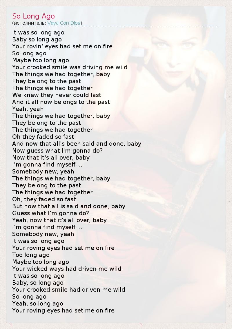 It was so long ago Baby so long ago Your rovin' eyes had set me on fire So long ago Maybe too long ago Your crooked smile was driving me wild The things we had together, baby They belong to the past The things we had together We knew they never could last And it all now belongs to the past Yeah, yeah The things we had together, baby They belong to the past The things we had together Oh they faded so fast And now that all's been said and done, baby Now guess what I'm gonna do? Now that it's all over, baby I'm gonna find myself ... Somebody new, yeah The things we had together, baby They belong to the past The things we had together Oh, they faded so fast But now that all is said and done, baby Guess what I'm gonna do? Yeah, now that it's all over, baby I'm gonna find myself ... Somebody new, yeah It was so long ago Your roving eyes had set me on fire Too long ago Maybe too long ago Your wicked ways had driven me wild It was so long ago Baby, so long ago Your crooked smile had driven me wild So long ago Yeah, so long ago Your roving eyes had set me on fire