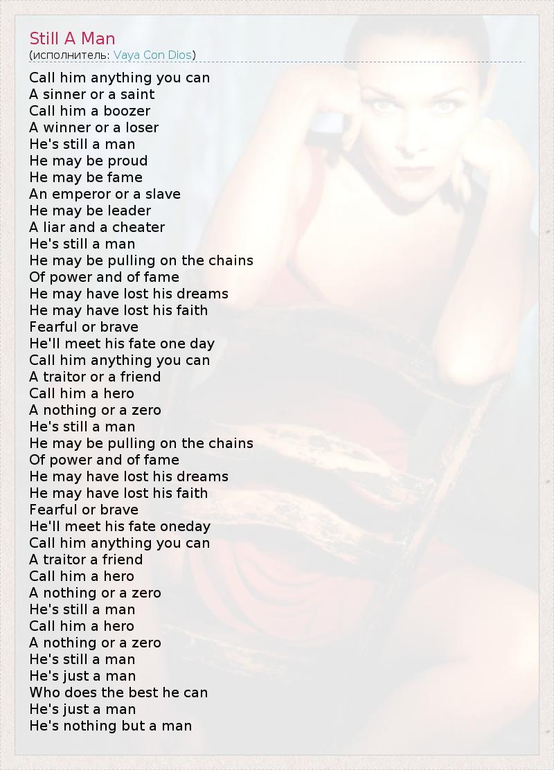 Call him anything you can A sinner or a saint Call him a boozer A winner or a loser He's still a man He may be proud He may be fame An emperor or a slave He may be leader A liar and a cheater He's still a man He may be pulling on the chains Of power and of fame He may have lost his dreams He may have lost his faith Fearful or brave He'll meet his fate one day Call him anything you can A traitor or a friend Call him a hero A nothing or a zero He's still a man He may be pulling on the chains Of power and of fame He may have lost his dreams He may have lost his faith Fearful or brave He'll meet his fate oneday Call him anything you can A traitor a friend Call him a hero A nothing or a zero He's still a man Call him a hero A nothing or a zero He's still a man He's just a man Who does the best he can He's just a man He's nothing but a man
