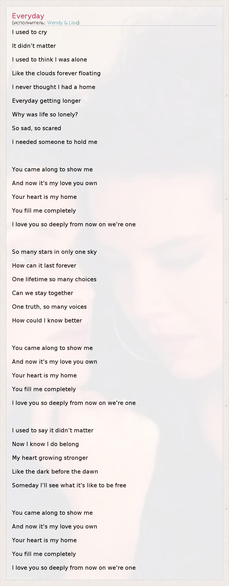 I used to cry It didn't matter I used to think I was alone Like the clouds forever floating I never thought I had a home Everyday getting longer Why was life so lonely? So sad, so scared I needed someone to hold me You came along to show me And now it's my love you own Your heart is my home You fill me completely I love you so deeply from now on we're one So many stars in only one sky How can it last forever One lifetime so many choices Can we stay together One truth, so many voices How could I know better You came along to show me And now it's my love you own Your heart is my home You fill me completely I love you so deeply from now on we're one I used to say it didn't matter Now I know I do belong My heart growing stronger Like the dark before the dawn Someday I'll see what it's like to be free You came along to show me And now it's my love you own Your heart is my home You fill me completely I love you so deeply from now on we're one