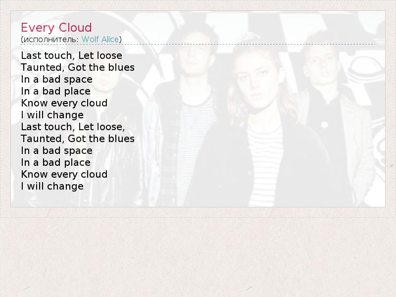 Last touch, Let loose Taunted, Got the blues In a bad space In a bad place Know every cloud I will change Last touch, Let loose, Taunted, Got the blues In a bad space In a bad place Know every cloud I will change