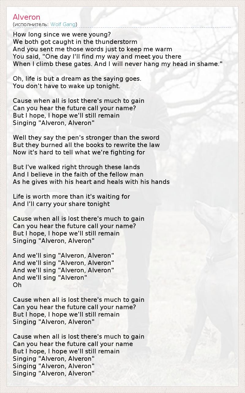 How long since we were young? We both got caught in the thunderstorm And you sent me those words just to keep me warm You said, "One day I'll find my way and meet you there When I climb these gates. And I will never hang my head in shame." Oh, life is but a dream as the saying goes. You don't have to wake up tonight. Cause when all is lost there's much to gain Can you hear the future call your name? But I hope, I hope we'll still remain Singing "Alveron, Alveron" Well they say the pen's stronger than the sword But they burned all the books to rewrite the law Now it's hard to tell what we're fighting for But I've walked right through these lands And I believe in the faith of the fellow man As he gives with his heart and heals with his hands Life is worth more than it's waiting for And I'll carry your share tonight Cause when all is lost there's much to gain Can you hear the future call your name? But I hope, I hope we'll still remain Singing "Alveron, Alveron" And we'll sing "Alveron, Alveron" And we'll sing "Alveron, Alveron" And we'll sing "Alveron, Alveron" And we'll sing "Alveron" Oh Cause when all is lost there's much to gain Can you hear the future call your name? But I hope, I hope we'll still remain Singing "Alveron, Alveron" Cause when all is lost there's much to gain Can you hear the future call your name But I hope, I hope we'll still remain Singing "Alveron, Alveron" Singing "Alveron, Alveron" Singing "Alveron, Alveron"