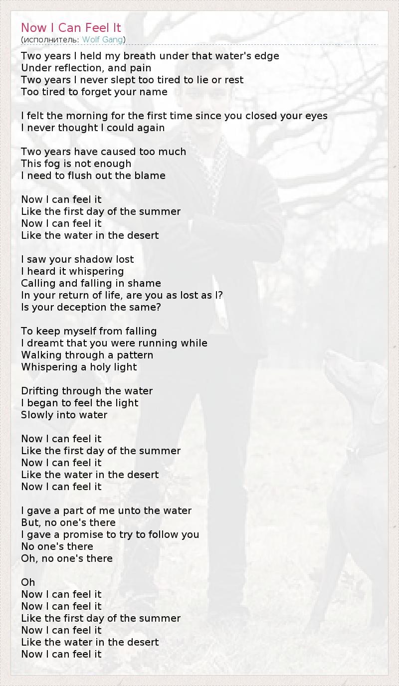 Two years I held my breath under that water's edge Under reflection, and pain Two years I never slept too tired to lie or rest Too tired to forget your name I felt the morning for the first time since you closed your eyes I never thought I could again Two years have caused too much This fog is not enough I need to flush out the blame Now I can feel it Like the first day of the summer Now I can feel it Like the water in the desert I saw your shadow lost I heard it whispering Calling and falling in shame In your return of life, are you as lost as I? Is your deception the same? To keep myself from falling I dreamt that you were running while Walking through a pattern Whispering a holy light Drifting through the water I began to feel the light Slowly into water Now I can feel it Like the first day of the summer Now I can feel it Like the water in the desert Now I can feel it I gave a part of me unto the water But, no one's there I gave a promise to try to follow you No one's there Oh, no one's there Oh Now I can feel it Now I can feel it Like the first day of the summer Now I can feel it Like the water in the desert Now I can feel it