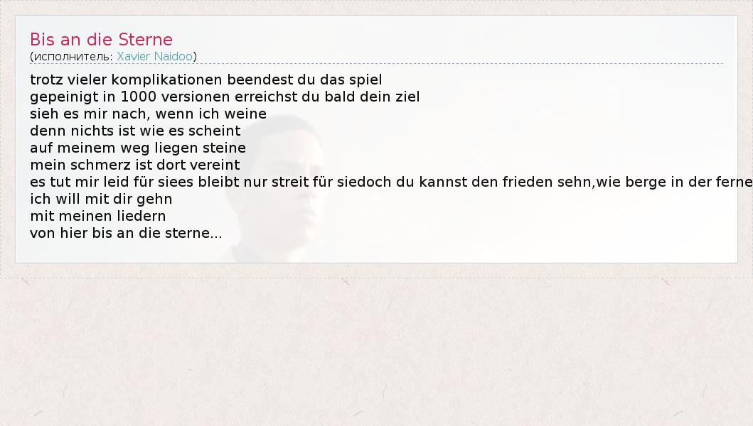 trotz vieler komplikationen beendest du das spiel gepeinigt in 1000 versionen erreichst du bald dein ziel sieh es mir nach, wenn ich weine denn nichts ist wie es scheint auf meinem weg liegen steine mein schmerz ist dort vereint es tut mir leid für siees bleibt nur streit für siedoch du kannst den frieden sehn,wie berge in der ferne ich will mit dir gehn mit meinen liedern von hier bis an die sterne...