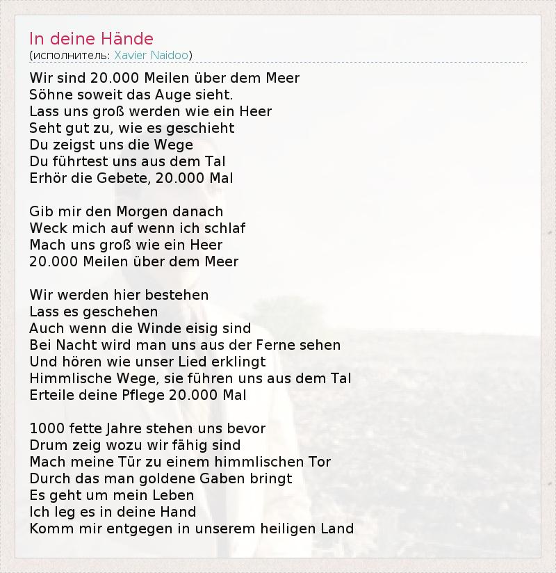 Перевод взяла отсюда http://de.lyrsense.com/xavier_naidoo/20000_meilen Мы на высоте 20 000 миль над уровнем моря, сыновья настолько далеко, насколько видят глаза. Пусть нас станет больше, как войско, смотри, как это происходит. Ты показал нам пути, ты выводишь нас из долины, услышь молитву 20 000 раз. Дай мне завтрашний день, затем разбуди меня, когда я сплю, сделай нас больше, словно войско. 20 000 миль над уровнем моря. Мы выстоим здесь, пусть это произойдет, даже если леденящий ветер будет. В ночи нас будут видеть издалека и слышать, как звучит наша песня. Райские дороги, они выводят нас из долины, отдают твою заботу 20 000 раз. 1000 урожайных лет нас ждет, поэтому покажи нам, к чему мы способны. Открой мои двери к райским воротам, через которые золотые дары можно принести. Речь идёт о моей жизни, я отдаю ее в твои руки. Приди к нам навстречу, в нашу святую землю.