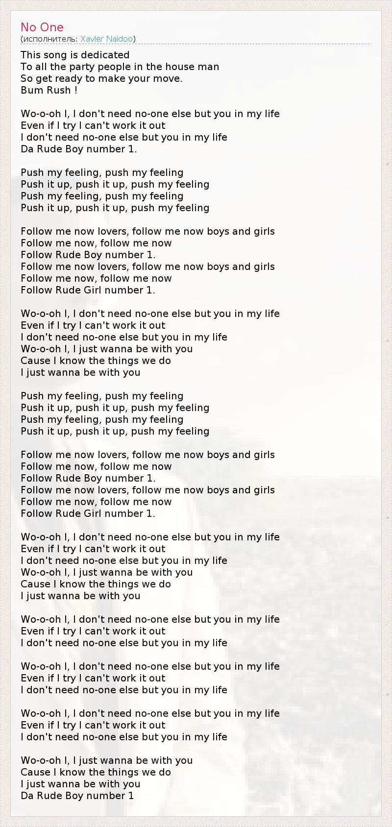 This song is dedicated To all the party people in the house man So get ready to make your move. Bum Rush ! Wo-o-oh I, I don't need no-one else but you in my life Even if I try I can't work it out I don't need no-one else but you in my life Da Rude Boy number 1. Push my feeling, push my feeling Push it up, push it up, push my feeling Push my feeling, push my feeling Push it up, push it up, push my feeling Follow me now lovers, follow me now boys and girls Follow me now, follow me now Follow Rude Boy number 1. Follow me now lovers, follow me now boys and girls Follow me now, follow me now Follow Rude Girl number 1. Wo-o-oh I, I don't need no-one else but you in my life Even if I try I can't work it out I don't need no-one else but you in my life Wo-o-oh I, I just wanna be with you Cause I know the things we do I just wanna be with you Push my feeling, push my feeling Push it up, push it up, push my feeling Push my feeling, push my feeling Push it up, push it up, push my feeling Follow me now lovers, follow me now boys and girls Follow me now, follow me now Follow Rude Boy number 1. Follow me now lovers, follow me now boys and girls Follow me now, follow me now Follow Rude Girl number 1. Wo-o-oh I, I don't need no-one else but you in my life Even if I try I can't work it out I don't need no-one else but you in my life Wo-o-oh I, I just wanna be with you Cause I know the things we do I just wanna be with you Wo-o-oh I, I don't need no-one else but you in my life Even if I try I can't work it out I don't need no-one else but you in my life Wo-o-oh I, I don't need no-one else but you in my life Even if I try I can't work it out I don't need no-one else but you in my life Wo-o-oh I, I don't need no-one else but you in my life Even if I try I can't work it out I don't need no-one else but you in my life Wo-o-oh I, I just wanna be with you Cause I know the things we do I just wanna be with you Da Rude Boy number 1
