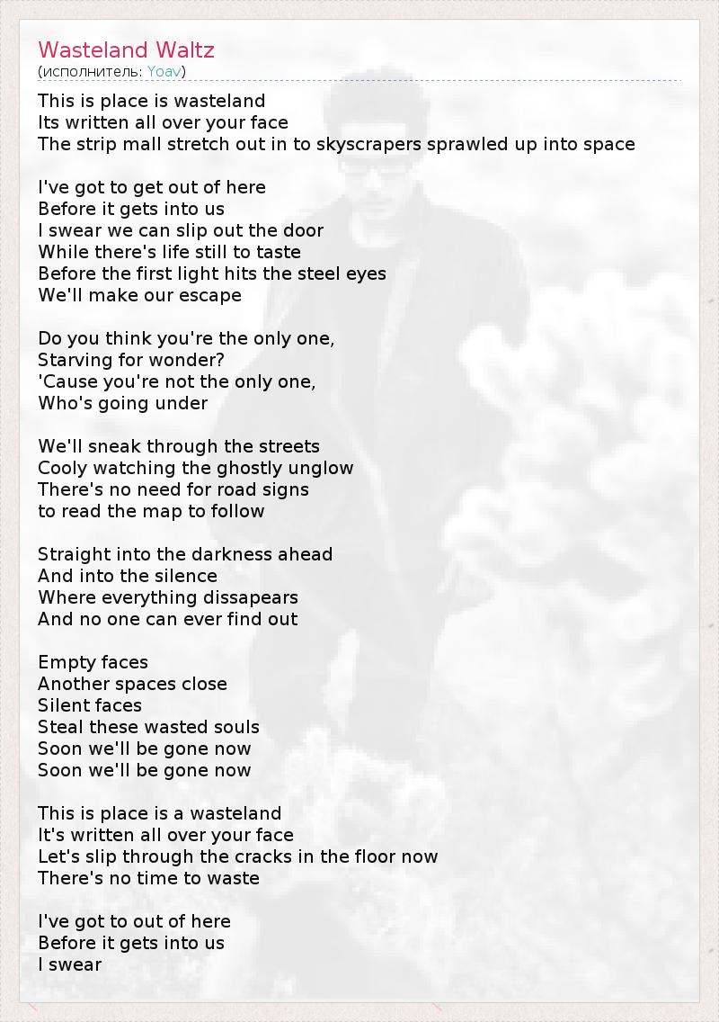 Вальс на пустыре Это место – пустырь, Это написано на твоём лице, Полоса молов тянется к небоскрёбам, Которые ползут в космос. Мне нужно выбираться отсюда, Пока эта дрянь не проникла внутрь, Клянусь, мы можем выскользнуть за дверь, Там есть другая жизнь. До того, как первый свет ударит по стальным глазам, Мы сбежим. Думаешь, ты единственный, Кто жаждет чудес? Ты не один такой, Идущий ко дну. Мы прокрадёмся по улицам, Осторожно глядя в загадочную темень, Не надо больше дорожных знаков, Чтобы разобраться в карте. Вперёд – в темноту, что впереди, В тишину, в которой Исчезает всё, И никто не узнает тайну. Пустые лица, Закрытые пространства, Молчаливые лица, Крадущие замусоренные души, Мы скоро уйдём, Мы скоро уйдём. Это место – пустырь, Это написано на твоём лице, Просочимся сквозь щели в полу, Нельзя терять времени. Мне нужно выбираться отсюда, Пока эта дрянь не проникла внутрь, Клянусь