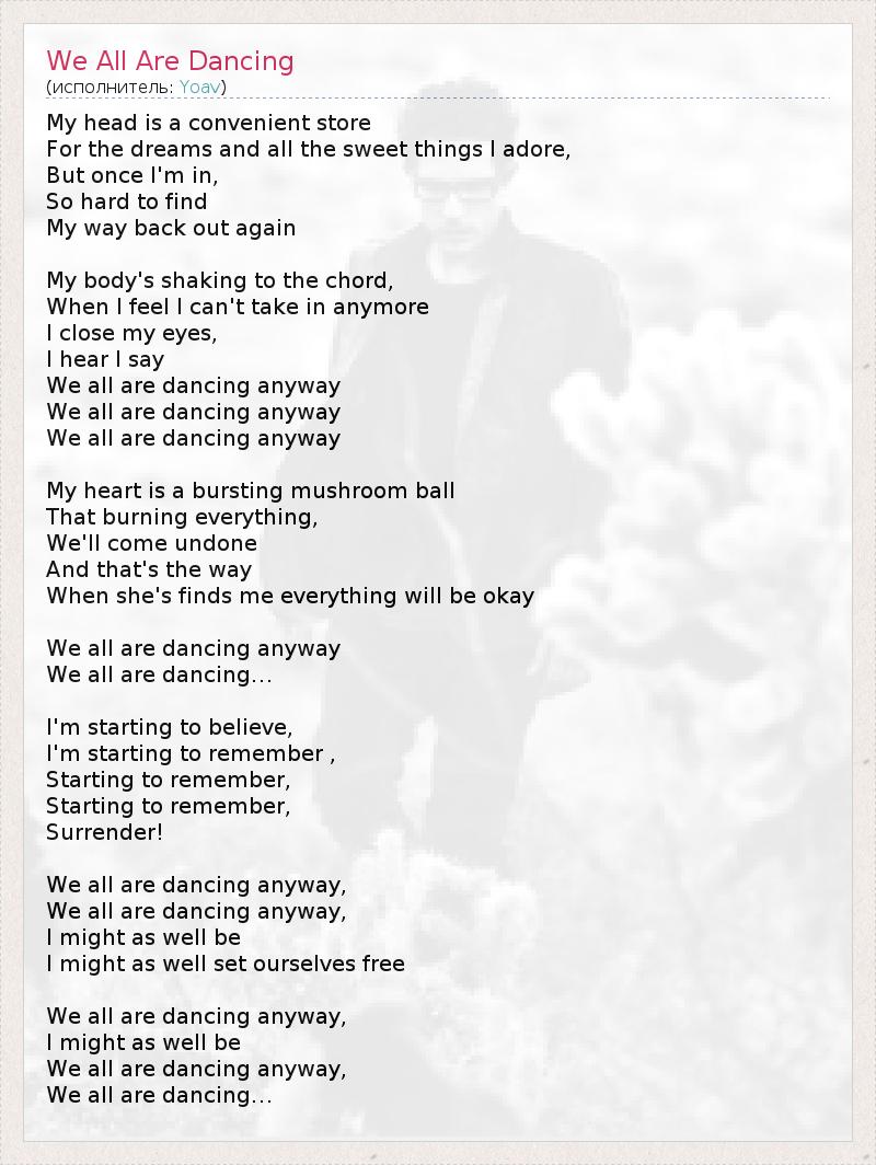 My head is a convenient store For the dreams and all the sweet things I adore, But once I'm in, So hard to find My way back out again My body's shaking to the chord, When I feel I can't take in anymore I close my eyes, I hear I say We all are dancing anyway We all are dancing anyway We all are dancing anyway My heart is a bursting mushroom ball That burning everything, We'll come undone And that's the way When she's finds me everything will be okay We all are dancing anyway We all are dancing… I'm starting to believe, I'm starting to remember , Starting to remember, Starting to remember, Surrender! We all are dancing anyway, We all are dancing anyway, I might as well be I might as well set ourselves free We all are dancing anyway, I might as well be We all are dancing anyway, We all are dancing…