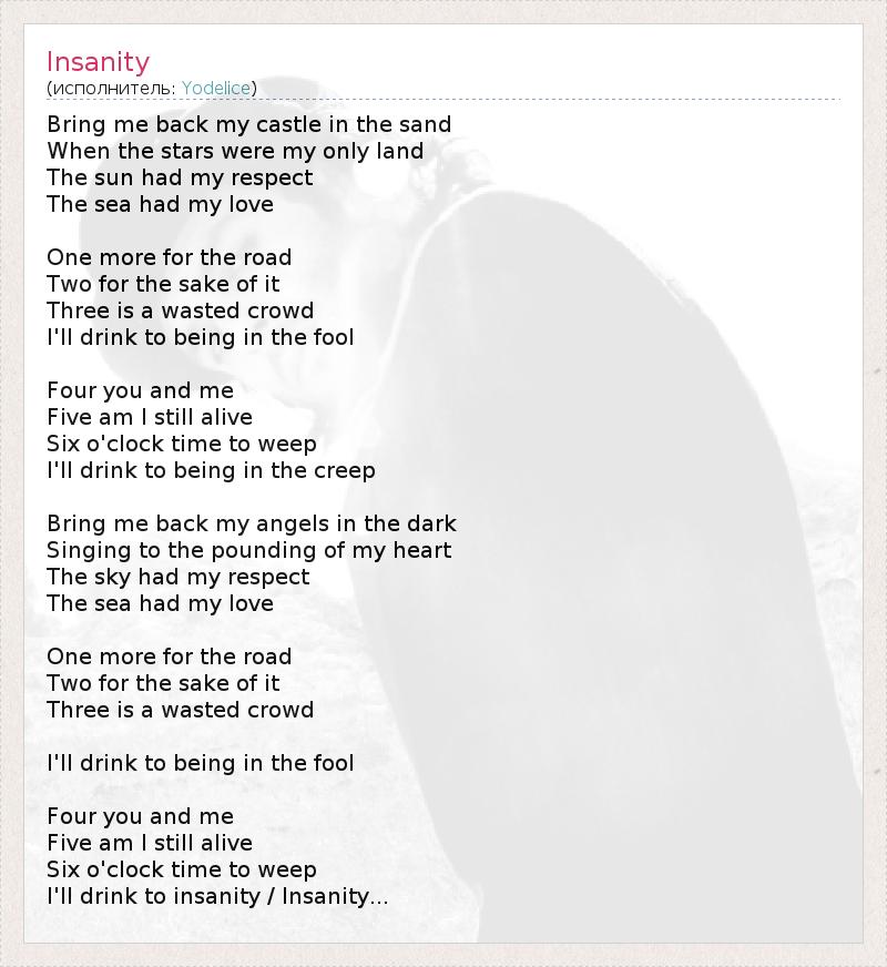 Bring me back my castle in the sand When the stars were my only land The sun had my respect The sea had my love One more for the road Two for the sake of it Three is a wasted crowd I'll drink to being in the fool Four you and me Five am I still alive Six o'clock time to weep I'll drink to being in the creep Bring me back my angels in the dark Singing to the pounding of my heart The sky had my respect The sea had my love One more for the road Two for the sake of it Three is a wasted crowd I'll drink to being in the fool Four you and me Five am I still alive Six o'clock time to weep I'll drink to insanity / Insanity...