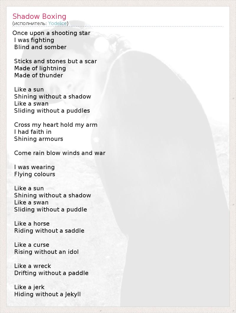 Once upon a shooting star I was fighting Blind and somber Sticks and stones but a scar Made of lightning Made of thunder Like a sun Shining without a shadow Like a swan Sliding without a puddles Cross my heart hold my arm I had faith in Shining armours Come rain blow winds and war I was wearing Flying colours Like a sun Shining without a shadow Like a swan Sliding without a puddle Like a horse Riding without a saddle Like a curse Rising without an idol Like a wreck Drifting without a paddle Like a jerk Hiding without a Jekyll