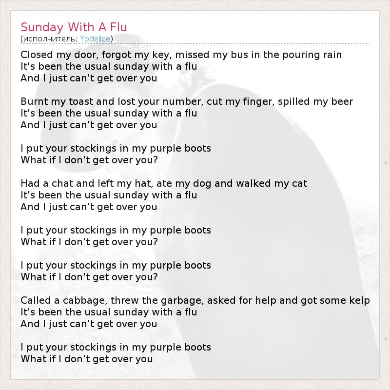 Закрыл дверь , забыл свой ключ , опоздал на свой автобус под проливным дождем Это было обычное воскресенье с гриппом И я просто не могу получить над вами Утомленные свой тост и потерял свой номер , порезал себе палец , пролитой мое пиво Это было обычное воскресенье с гриппом И я просто не могу получить над вами Я положил свои чулки в моих фиолетовых сапогах Что делать, если я не получаю над вами ? Имел беседу и оставил свою шляпу , ели мою собаку и пошел мой кот Это было обычное воскресенье с гриппом И я просто не могу получить над вами Я положил свои чулки в моих фиолетовых сапогах Что делать, если я не получаю над вами ? Я положил свои чулки в моих фиолетовых сапогах Что делать, если я не получаю над вами ? Вызываетсякапуста, бросил мусор , обратился за помощью и получили некоторый водоросли Это было обычное воскресенье с гриппом И я просто не могу получить над вами Я положил свои чулки в моих фиолетовых сапогах Что делать, если я не получаю над вами