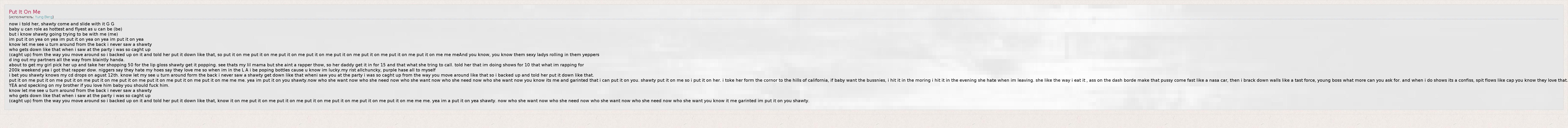 put it on me put it on me put it on me put it on me put it on me put it on me put it on me put it on me me me. yea im put it on you shawty.now who she want now who she need now who she want now who she need now who she want now you know its me and garinted that i can put it on you. shawty put it on me so i put it on her. i toke her form the cornor to the hills of california, if baby want the bussnies, i hit it in the moring i hit it in the evening she hate when im leaving. she like the way i eat it , ass on the dash borde make that pussy come fast like a nasa car, then i brack down walls like a tast force, young boss what more can you ask for. and when i do shows its a confiss, spit flows like cap you know they love that.