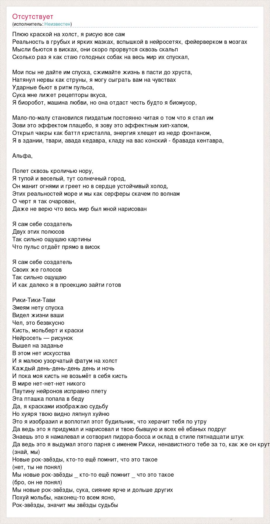 Плюю краской на холст, я рисую все сам Реальность в грубых и ярких мазках, вспышкой в нейросетях, фейерверком в мозгах Мысли бьются в висках, они скоро прорвутся сквозь скальп Сколько раз я как стаю голодных собак на весь мир их спускал, Мои псы не дайте им спуска, сжимайте жизнь в пасти до хруста, Натянул нервы как струны, я могу сыграть вам на чувствах Ударные бьют в ритм пульса, Сука мне лижет рецепторы вкуса, Я биоробот, машина любви, но она отдаст честь будто я биомусор, Мало-по-малу становился пиздатым постоянно читая о том что я стал им Зови это эффектом плацебо, я зову это эффектным хип-хапом, Открыл чакры как баттл кристалла, энергия хлещет из недр фонтаном, Я в здании, твари, авада кедавра, кладу на вас конский - бравада кентавра, Альфа, Полет сквозь кроличью нору, Я тупой и веселый, тут солнечный город, Он манит огнями и греет но в сердце устойчивый холод, Этих реальностей море и мы как серферы скачем по волнам О черт я так очарован, Даже не верю что весь мир был мной нарисован Я сам себе создатель Двух этих полюсов Так сильно ощущаю картины Что пульс отдаёт прямо в висок Я сам себе создатель Своих же голосов Так сильно ощущаю И как далеко я в проекцию зайти готов Рики-Тики-Тави Змеям нету спуска Видел жизни ваши Чел, это безвкусно Кисть, мольберт и краски Нейросеть — рисунок Вышел на заданье В этом нет искусства И я малюю узорчатый фатум на холст Каждый день-день-день день и ночь И пока моя кисть не возьмёт в себя кисть В мире нет-нет-нет никого Паутину нейронов исправно плету Эта пташка попала в беду Да, я красками изображаю судьбу Но хуяря твою видно ляпнул хуйню Это я изобразил и воплотил этот будильник, что херачит тебя по утру Да ведь это я придумал и нарисовал и твою бывшую и всех её ебаных подруг Знаешь это я намалевал и сотворил пидора-босса и оклад в стиле пятнадцати штук Да ведь это я выдумал этого парня с именем Рикки, ненавистного тебе за то, как же он крут (знай, мы) Новые рок-звёзды, кто-то ещё помнит, что это такое (нет, ты не понял) Мы новые рок-звёзды _ кто-то ещё помнит _ что это такое (бро, он не понял) Мы новые рок-звёзды, сука, сияние ярче и дольше других Похуй мольбы, наконец-то всем ясно, Рок-звёзды, значит мы звёзды судьбы