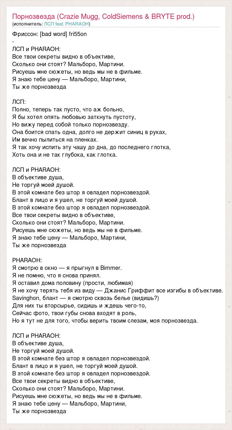 Фриссон: [bad word] fri55on - ЛСП и PHARAOH: Все твои секреты видно в объективе, Сколько они стоят? Мальборо, Мартини. Рисуешь мне сюжеты, но ведь мы не в фильме. Я знаю тебе цену — Мальборо, Мартини, Ты же порнозвезда ЛСП: Полно, теперь так пусто, что аж больно, Я бы хотел опять любовью заткнуть пустоту, Но вижу перед собой только порнозвезду. Она боится спать одна, долго не держит синиц в руках, Им вечно пылиться на пленках. Я так хочу испить эту чашу до дна, до последнего глотка, Хоть она и не так глубока, как глотка. ЛСП и PHARAOH: В объективе душа, Не торгуй моей душой. В этой комнате без штор я овладел порнозвездой. Блант в лицо и я ушел, не торгуй моей душой. В этой комнате без штор я овладел порнозвездой. Все твои секреты видно в объективе, Сколько они стоят? Мальборо, Мартини. Рисуешь мне сюжеты, но ведь мы не в фильме. Я знаю тебе цену — Мальборо, Мартини, Ты же порнозвезда PHARAOH: Я смотрю в окно — я прыгнул в Bimmer. Я не помню, что я снова принял. Я оставил дома половину (прости, любимая) Я не хочу терять тебя из виду — Джанис Гриффит все изгибы в объективе. Savinghon, блант — я смотрю сквозь белье (видишь?) Для них ты вторсырье, сидишь и ждешь чего-то, Сейчас фото, твои губы снова входят в роль, Но я тут не для того, чтобы верить твоим слезам, моя порнозвезда. ЛСП и PHARAOH: В объективе душа, Не торгуй моей душой. В этой комнате без штор я овладел порнозвездой. Блант в лицо и я ушел, не торгуй моей душой. В этой комнате без штор я овладел порнозвездой. Все твои секреты видно в объективе, Сколько они стоят? Мальборо, Мартини. Рисуешь мне сюжеты, но ведь мы не в фильме. Я знаю тебе цену — Мальборо, Мартини, Ты же порнозвезда