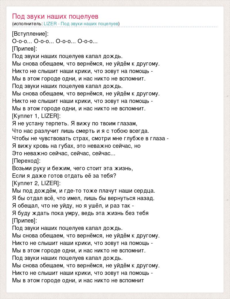 [Вступление]: О-о-о... О-о-о... О-о-о... О-о-о... [Припев]: Под звуки наших поцелуев капал дождь. Мы снова обещаем, что вернёмся, не уйдём к другому. Никто не слышит наши крики, что зовут на помощь - Мы в этом городе одни, и нас никто не вспомнит. Под звуки наших поцелуев капал дождь. Мы снова обещаем, что вернёмся, не уйдём к другому. Никто не слышит наши крики, что зовут на помощь - Мы в этом городе одни, и нас никто не вспомнит. [Куплет 1, LIZER]: Я не устану терпеть. Я вижу по твоим глазам, Что нас разлучит лишь смерть и я с тобою всегда. Чтобы не чувствовать страх, смотри мне глубже в глаза - Я вижу кровь на губах, это неважно сейчас, но Это неважно сейчас, сейчас, сейчас... [Переход]: Возьми руку и бежим, чего стоит эта жизнь, Если я даже готов отдать её за тебя? [Куплет 2, LIZER]: Мы под дождём, и где-то тоже плачут наши сердца. Я бы отдал всё, что имел, лишь бы вернуться назад. Я обещал, что не уйду, но я ушёл, и раз так - Я буду ждать пока умру, ведь эта жизнь без тебя [Припев]: Под звуки наших поцелуев капал дождь. Мы снова обещаем, что вернёмся, не уйдём к другому. Никто не слышит наши крики, что зовут на помощь - Мы в этом городе одни, и нас никто не вспомнит. Под звуки наших поцелуев капал дождь. Мы снова обещаем, что вернёмся, не уйдём к другому. Никто не слышит наши крики, что зовут на помощь - Мы в этом городе одни, и нас никто не вспомнит