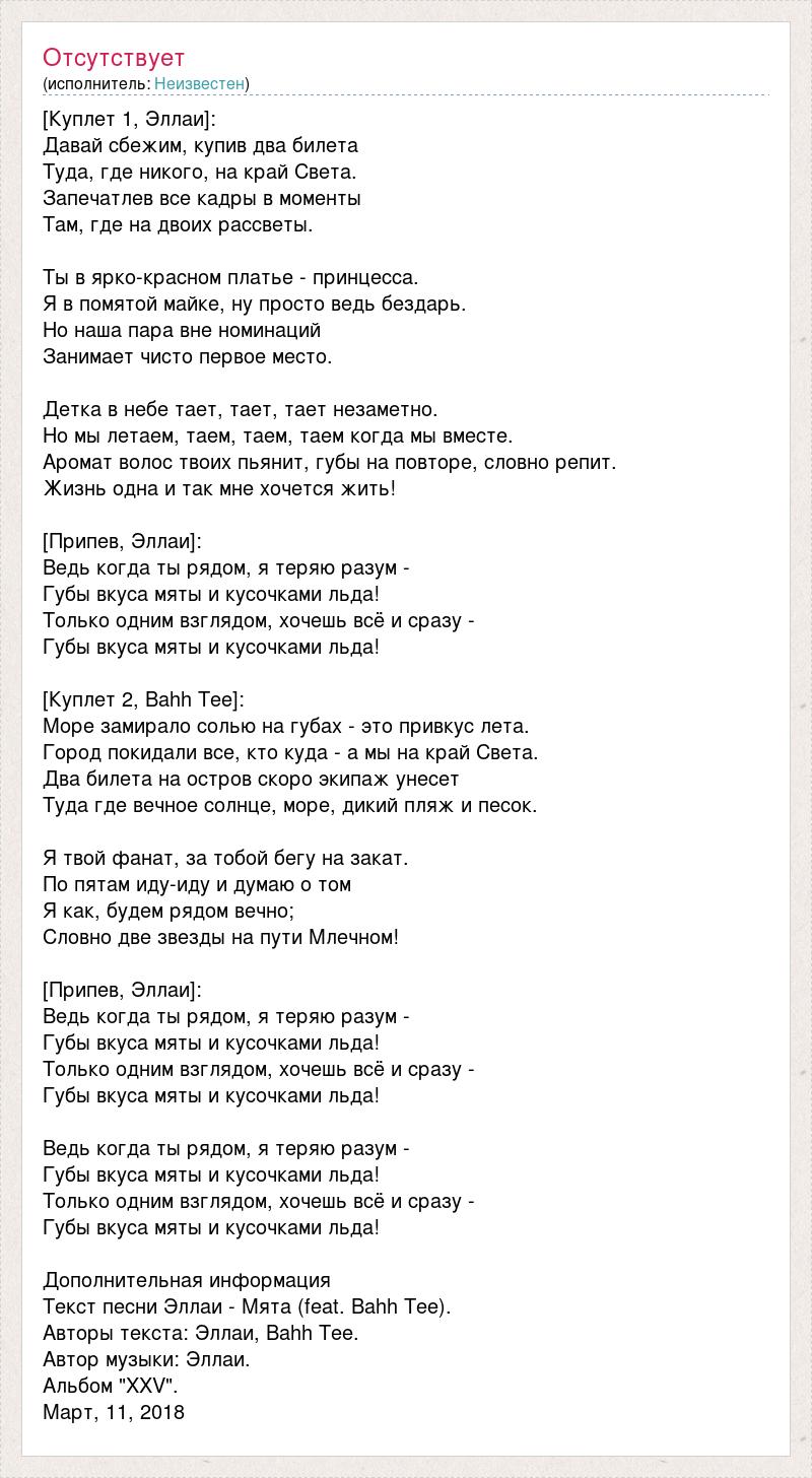 [Куплет 1, Эллаи]: Давай сбежим, купив два билета Туда, где никого, на край Света. Запечатлев все кадры в моменты Там, где на двоих рассветы. Ты в ярко-красном платье - принцесса. Я в помятой майке, ну просто ведь бездарь. Но наша пара вне номинаций Занимает чисто первое место. Детка в небе тает, тает, тает незаметно. Но мы летаем, таем, таем, таем когда мы вместе. Аромат волос твоих пьянит, губы на повторе, словно репит. Жизнь одна и так мне хочется жить! [Припев, Эллаи]: Ведь когда ты рядом, я теряю разум - Губы вкуса мяты и кусочками льда! Только одним взглядом, хочешь всё и сразу - Губы вкуса мяты и кусочками льда! [Куплет 2, Bahh Tee]: Море замирало солью на губах - это привкус лета. Город покидали все, кто куда - а мы на край Света. Два билета на остров скоро экипаж унесет Туда где вечное солнце, море, дикий пляж и песок. Я твой фанат, за тобой бегу на закат. По пятам иду-иду и думаю о том Я как, будем рядом вечно; Словно две звезды на пути Млечном! [Припев, Эллаи]: Ведь когда ты рядом, я теряю разум - Губы вкуса мяты и кусочками льда! Только одним взглядом, хочешь всё и сразу - Губы вкуса мяты и кусочками льда! Ведь когда ты рядом, я теряю разум - Губы вкуса мяты и кусочками льда! Только одним взглядом, хочешь всё и сразу - Губы вкуса мяты и кусочками льда! Дополнительная информация Текст песни Эллаи - Мята (feat. Bahh Tee). Авторы текста: Эллаи, Bahh Tee. Автор музыки: Эллаи. Альбом "XXV". Март, 11, 2018