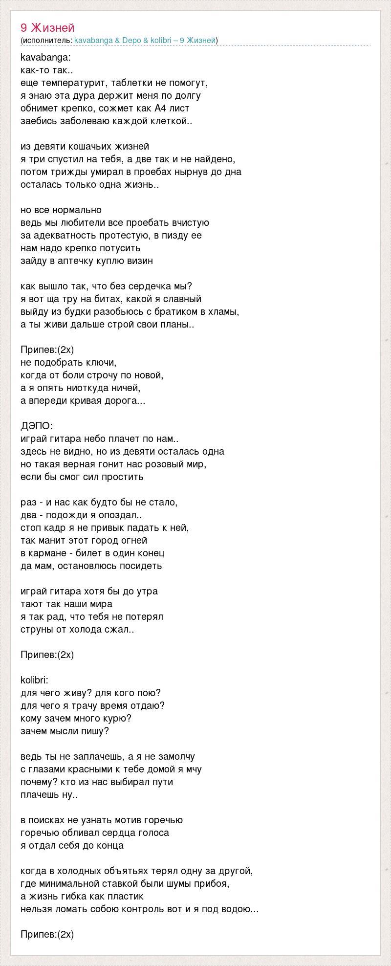 kavabanga: как-то так.. еще температурит, таблетки не помогут, я знаю эта дура держит меня по долгу обнимет крепко, сожмет как А4 лист заебись заболеваю каждой клеткой.. из девяти кошачьих жизней я три спустил на тебя, а две так и не найдено, потом трижды умирал в проебах нырнув до дна осталась только одна жизнь.. но все нормально ведь мы любители все проебать вчистую за адекватность протестую, в пизду ее нам надо крепко потусить зайду в аптечку куплю визин как вышло так, что без сердечка мы? я вот ща тру на битах, какой я славный выйду из будки разобьюсь с братиком в хламы, а ты живи дальше строй свои планы.. Припев:(2х) не подобрать ключи, когда от боли строчу по новой, а я опять ниоткуда ничей, а впереди кривая дорога... ДЭПО: играй гитара небо плачет по нам.. здесь не видно, но из девяти осталась одна но такая верная гонит нас розовый мир, если бы смог сил простить раз - и нас как будто бы не стало, два - подожди я опоздал.. стоп кадр я не привык падать к ней, так манит этот город огней в кармане - билет в один конец да мам, остановлюсь посидеть играй гитара хотя бы до утра тают так наши мира я так рад, что тебя не потерял струны от холода сжал.. Припев:(2х) kolibri: для чего живу? для кого пою? для чего я трачу время отдаю? кому зачем много курю? зачем мысли пишу? ведь ты не заплачешь, а я не замолчу с глазами красными к тебе домой я мчу почему? кто из нас выбирал пути плачешь ну.. в поисках не узнать мотив горечью горечью обливал сердца голоса я отдал себя до конца когда в холодных объятьях терял одну за другой, где минимальной ставкой были шумы прибоя, а жизнь гибка как пластик нельзя ломать собою контроль вот и я под водою... Припев:(2х)