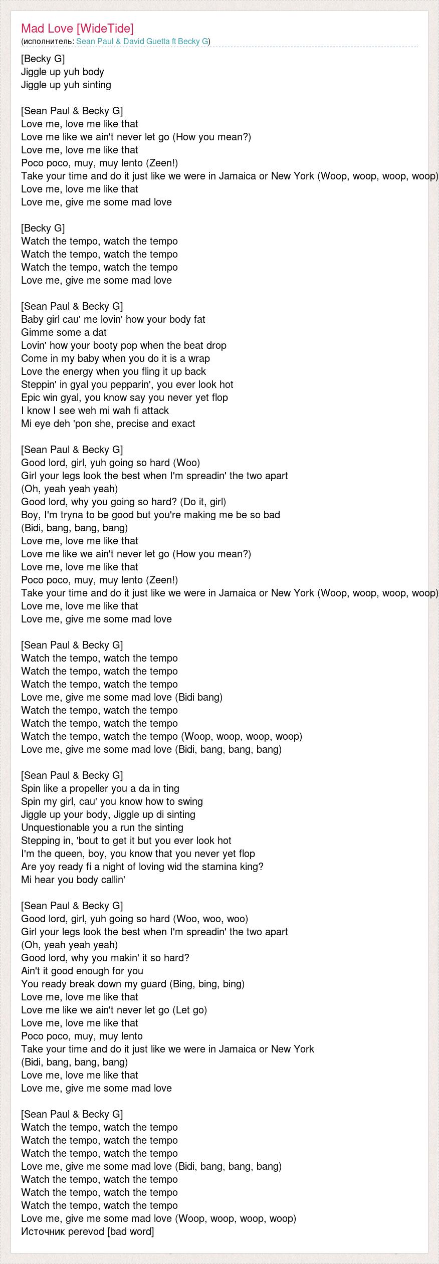 [Becky G] Jiggle up yuh body Jiggle up yuh sinting [Sean Paul & Becky G] Love me, love me like that Love me like we ain't never let go (How you mean?) Love me, love me like that Poco poco, muy, muy lento (Zeen!) Take your time and do it just like we were in Jamaica or New York (Woop, woop, woop, woop) Love me, love me like that Love me, give me some mad love [Becky G] Watch the tempo, watch the tempo Watch the tempo, watch the tempo Watch the tempo, watch the tempo Love me, give me some mad love [Sean Paul & Becky G] Baby girl cau' me lovin' how your body fat Gimme some a dat Lovin' how your booty pop when the beat drop Come in my baby when you do it is a wrap Love the energy when you fling it up back Steppin' in gyal you pepparin', you ever look hot Epic win gyal, you know say you never yet flop I know I see weh mi wah fi attack Mi eye deh 'pon she, precise and exact [Sean Paul & Becky G] Good lord, girl, yuh going so hard (Woo) Girl your legs look the best when I'm spreadin' the two apart (Oh, yeah yeah yeah) Good lord, why you going so hard? (Do it, girl) Boy, I'm tryna to be good but you're making me be so bad (Bidi, bang, bang, bang) Love me, love me like that Love me like we ain't never let go (How you mean?) Love me, love me like that Poco poco, muy, muy lento (Zeen!) Take your time and do it just like we were in Jamaica or New York (Woop, woop, woop, woop) Love me, love me like that Love me, give me some mad love [Sean Paul & Becky G] Watch the tempo, watch the tempo Watch the tempo, watch the tempo Watch the tempo, watch the tempo Love me, give me some mad love (Bidi bang) Watch the tempo, watch the tempo Watch the tempo, watch the tempo Watch the tempo, watch the tempo (Woop, woop, woop, woop) Love me, give me some mad love (Bidi, bang, bang, bang) [Sean Paul & Becky G] Spin like a propeller you a da in ting Spin my girl, cau' you know how to swing Jiggle up your body, Jiggle up di sinting Unquestionable you a run the sinting Stepping in, 'bout to get it but you ever look hot I'm the queen, boy, you know that you never yet flop Are yoy ready fi a night of loving wid the stamina king? Mi hear you body callin' [Sean Paul & Becky G] Good lord, girl, yuh going so hard (Woo, woo, woo) Girl your legs look the best when I'm spreadin' the two apart (Oh, yeah yeah yeah) Good lord, why you makin' it so hard? Ain't it good enough for you You ready break down my guard (Bing, bing, bing) Love me, love me like that Love me like we ain't never let go (Let go) Love me, love me like that Poco poco, muy, muy lento Take your time and do it just like we were in Jamaica or New York (Bidi, bang, bang, bang) Love me, love me like that Love me, give me some mad love [Sean Paul & Becky G] Watch the tempo, watch the tempo Watch the tempo, watch the tempo Watch the tempo, watch the tempo Love me, give me some mad love (Bidi, bang, bang, bang) Watch the tempo, watch the tempo Watch the tempo, watch the tempo Watch the tempo, watch the tempo Love me, give me some mad love (Woop, woop, woop, woop) Источник perevod [bad word]