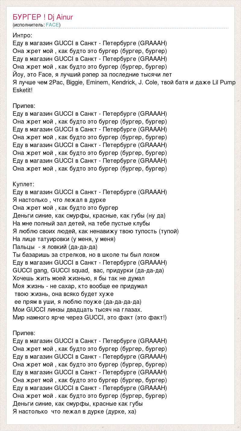 Интро: Еду в магазин GUCCI в Санкт - Петербурге (GRAAAH) Она жрет мой , как будто это бургер (бургер, бургер) Еду в магазин GUCCI в Санкт - Петербурге (GRAAAH) Она жрет мой , как будто это бургер (бургер, бургер) Йоу, это Face, я лучший рэпер за последние тысячи лет Я лучше чем 2Pac, Biggie, Eminem, Kendrick, J. Cole, твой батя и даже Lil Pump Esketit! Припев: Еду в магазин GUCCI в Санкт - Петербурге (GRAAAH) Она жрет мой , как будто это бургер (бургер, бургер) Еду в магазин GUCCI в Санкт - Петербурге (GRAAAH) Она жрет мой , как будто это бургер (бургер, бургер) Еду в магазин GUCCI в Санкт - Петербурге (GRAAAH) Она жрет мой , как будто это бургер (бургер, бургер) Еду в магазин GUCCI в Санкт - Петербурге (GRAAAH) Она жрет мой , как будто это бургер (бургер, бургер) Куплет: Еду в магазин GUCCI в Санкт - Петербурге (GRAAAH) Я настолько , что лежал в дурке Она жрет мой , как будто это бургер Деньги синие, как смурфы, красные, как губы (ну да) На мне полный зал детей, на тебе пустые клубы Я люблю своих людей, как ненавижу твою тупость (тупой) На лице татуировки (у меня, у меня) Пальцы - я ловкий (да-да-да) Ты базаришь за стрелков, но в школе ты был лохом Еду в магазин GUCCI в Санкт - Петербурге (GRAAAH) GUCCI gang, GUCCI squad, вас, придурки (да-да-да) Хочешь жить моей жизнью, я бы так не думал Моя жизнь - не сахар, кто вообще ее придумал твою жизнь, она всяко будет хуже ее прям в уши, я люблю поуже (да-да-да-да) Мои GUCCI линзы двадцать тысяч на глазах. Мир намного ярче через GUCCI, это факт (это факт!) Припев: Еду в магазин GUCCI в Санкт - Петербурге (GRAAAH) Она жрет мой , как будто это бургер (бургер, бургер) Еду в магазин GUCCI в Санкт - Петербурге (GRAAAH) Она жрет мой , как будто это бургер (бургер, бургер) Еду в магазин GUCCI в Санкт - Петербурге (GRAAAH) Она жрет мой , как будто это бургер (бургер, бургер) Еду в магазин GUCCI в Санкт - Петербурге (GRAAAH) Она жрет мой . как будто это бургер (бургер, бургер) Деньги синие, как смурфы, красные как губы Я настолько что лежал в дурке (дурке, ха)