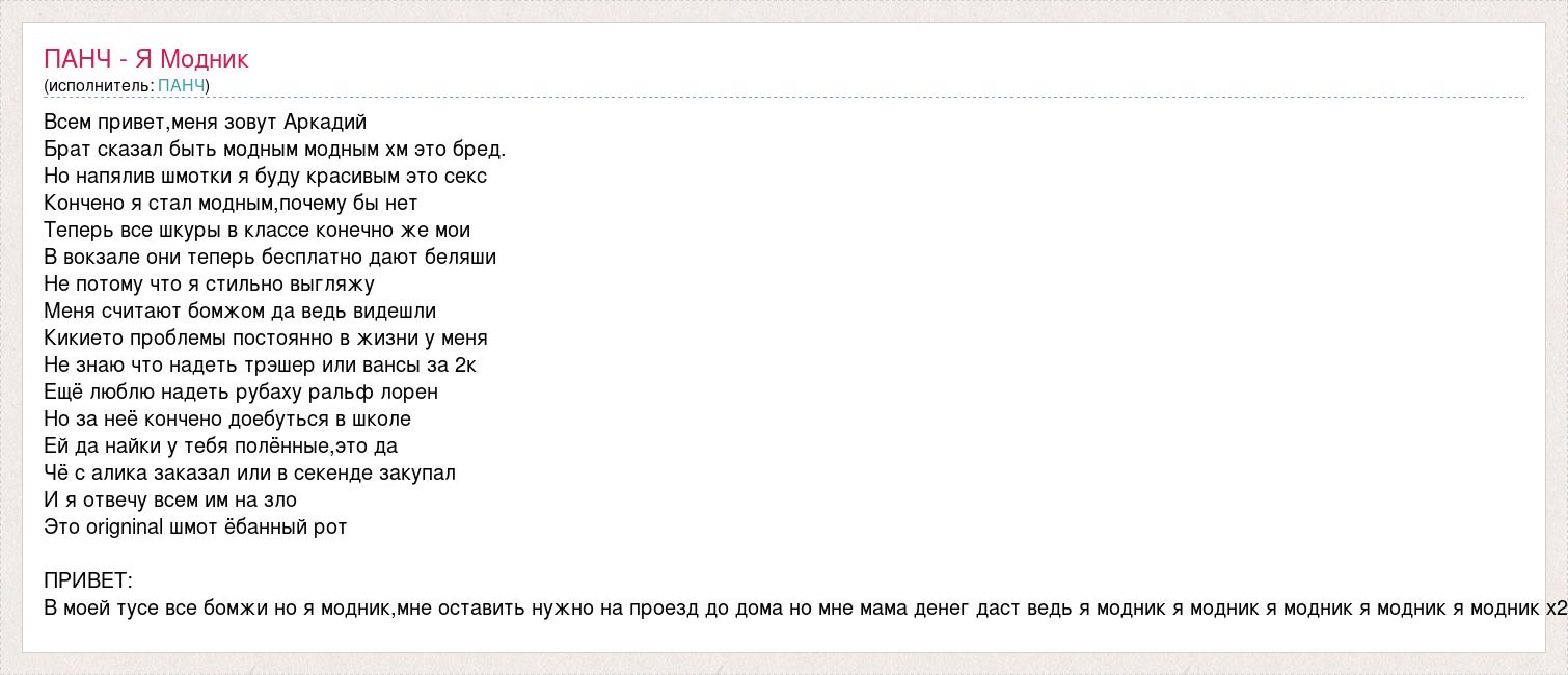 Всем привет,меня зовут Аркадий Брат сказал быть модным модным хм это бред. Но напялив шмотки я буду красивым это секс Кончено я стал модным,почему бы нет Теперь все шкуры в классе конечно же мои В вокзале они теперь бесплатно дают беляши Не потому что я стильно выгляжу Меня считают бомжом да ведь видешли Кикието проблемы постоянно в жизни у меня Не знаю что надеть трэшер или вансы за 2к Ещё люблю надеть рубаху ральф лорен Но за неё кончено доебуться в школе Ей да найки у тебя полённые,это да Чё с алика заказал или в секенде закупал И я отвечу всем им на зло Это origninal шмот ёбанный рот ПРИВЕТ: В моей тусе все бомжи но я модник,мне оставить нужно на проезд до дома но мне мама денег даст ведь я модник я модник я модник я модник я модник x2