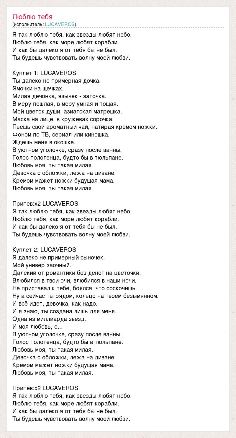 Я так люблю тебя, как звезды любят небо. Люблю тебя, как море любят корабли. И как бы далеко я от тебя бы не был. Ты будешь чувствовать волну моей любви. Куплет 1: LUCAVEROS Ты далеко не примерная дочка. Ямочки на щечках. Милая дечонка, язычек - заточка. В меру пошлая, в меру умная и тощая. Мой цветок души, азиатская матрешка. Маска на лице, в кружевах сорочка. Пьешь свой ароматный чай, натирая кремом ножки. Фоном по ТВ, сериал или киношка. Ждешь меня в окошке. В уютном уголочке, сразу после ванны. Голос полотенца, будто бы в тюльпане. Любовь моя, ты такая милая. Девочка с обложки, лежа на диване. Кремом мажет ножки будущая мама. Любовь моя, ты такая милая. Припев:х2 LUCAVEROS Я так люблю тебя, как звезды любят небо. Люблю тебя, как море любят корабли. И как бы далеко я от тебя бы не был. Ты будешь чувствовать волну моей любви. Куплет 2: LUCAVEROS Я далеко не примерный сыночек. Мой универ заочный. Далекий от романтики без денег на цветочки. Влюбился в твои очи, влюбился в наши ночи. Не приставал к тебе, боялся, что соскочишь. Ну а сейчас ты рядом, кольцо на твоем безымянном. И всё идет, девочка, как надо. И я знаю, ты создана лишь для меня. Одна из миллиарда звезд. И моя любовь, е... В уютном уголочке, сразу после ванны. Голос полотенца, будто бы в тюльпане. Любовь моя, ты такая милая. Девочка с обложки, лежа на диване. Кремом мажет ножки будущая мама. Любовь моя, ты такая милая. Припев:х2 LUCAVEROS Я так люблю тебя, как звезды любят небо. Люблю тебя, как море любят корабли. И как бы далеко я от тебя бы не был. Ты будешь чувствовать волну моей любви.