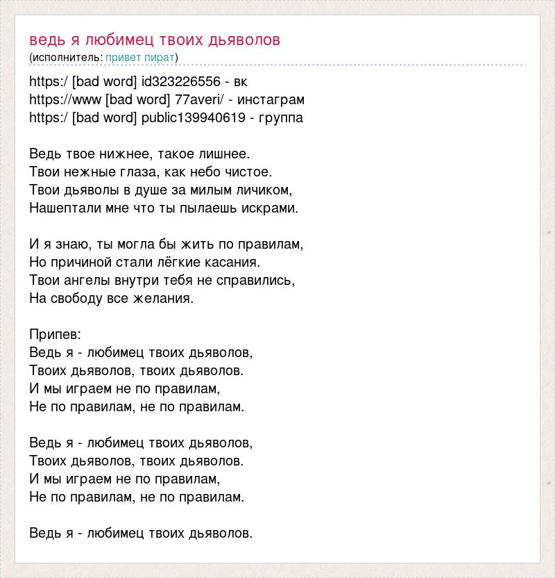 https:/ [bad word] id323226556 - вк https://www [bad word] 77averi/ - инстаграм https:/ [bad word] public139940619 - группа Ведь твое нижнее, такое лишнее. Твои нежные глаза, как небо чистое. Твои дьяволы в душе за милым личиком, Нашептали мне что ты пылаешь искрами. И я знаю, ты могла бы жить по правилам, Но причиной стали лёгкие касания. Твои ангелы внутри тебя не справились, На свободу все желания. Припев: Ведь я - любимец твоих дьяволов, Твоих дьяволов, твоих дьяволов. И мы играем не по правилам, Не по правилам, не по правилам. Ведь я - любимец твоих дьяволов, Твоих дьяволов, твоих дьяволов. И мы играем не по правилам, Не по правилам, не по правилам. Ведь я - любимец твоих дьяволов.