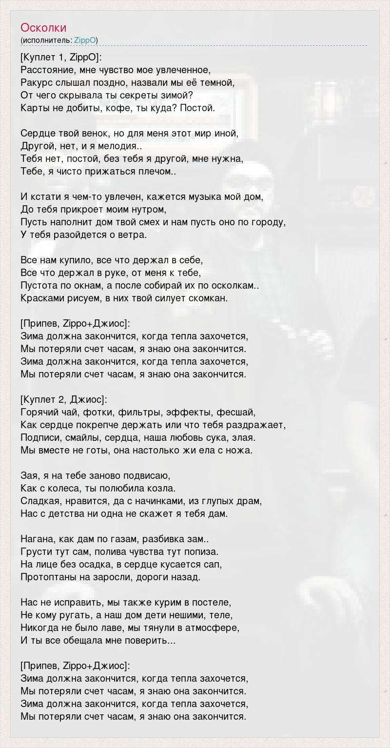 [Куплет 1, ZippO]: Расстояние, мне чувство мое увлеченное, Ракурс слышал поздно, назвали мы её темной, От чего скрывала ты секреты зимой? Карты не добиты, кофе, ты куда? Постой. Сердце твой венок, но для меня этот мир иной, Другой, нет, и я мелодия.. Тебя нет, постой, без тебя я другой, мне нужна, Тебе, я чисто прижаться плечом.. И кстати я чем-то увлечен, кажется музыка мой дом, До тебя прикроет моим нутром, Пусть наполнит дом твой смех и нам пусть оно по городу, У тебя разойдется о ветра. Все нам купило, все что держал в себе, Все что держал в руке, от меня к тебе, Пустота по окнам, а после собирай их по осколкам.. Красками рисуем, в них твой силует скомкан. [Припев, Zippo+Джиос]: Зима должна закончится, когда тепла захочется, Мы потеряли счет часам, я знаю она закончится. Зима должна закончится, когда тепла захочется, Мы потеряли счет часам, я знаю она закончится. [Куплет 2, Джиос]: Горячий чай, фотки, фильтры, эффекты, фесшай, Как сердце покрепче держать или что тебя раздражает, Подписи, смайлы, сердца, наша любовь сука, злая. Мы вместе не готы, она настолько жи ела с ножа. Зая, я на тебе заново подвисаю, Как с колеса, ты полюбила козла. Сладкая, нравится, да с начинками, из глупых драм, Нас с детства ни одна не скажет я тебя дам. Нагана, как дам по газам, разбивка зам.. Грусти тут сам, полива чувства тут попиза. На лице без осадка, в сердце кусается сап, Протоптаны на заросли, дороги назад. Нас не исправить, мы также курим в постеле, Не кому ругать, а наш дом дети нешими, теле, Никогда не было лаве, мы тянули в атмосфере, И ты все обещала мне поверить... [Припев, Zippo+Джиос]: Зима должна закончится, когда тепла захочется, Мы потеряли счет часам, я знаю она закончится. Зима должна закончится, когда тепла захочется, Мы потеряли счет часам, я знаю она закончится.
