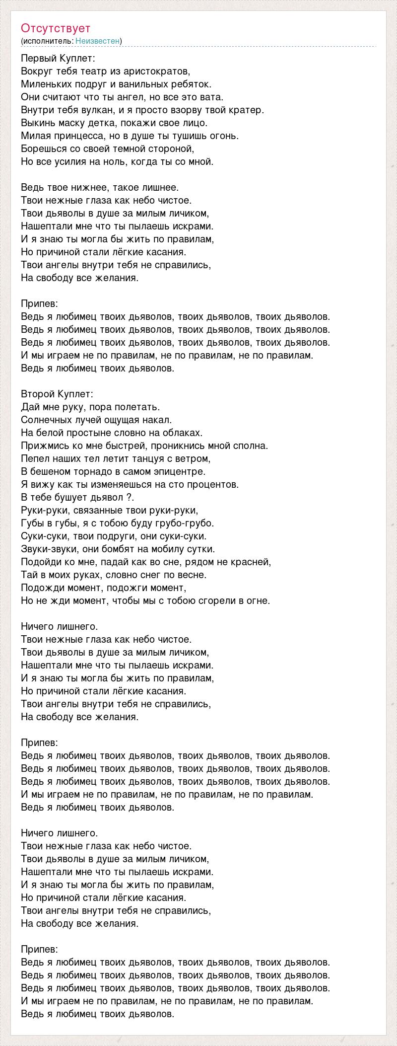 Первый Куплет: Вокруг тебя театр из аристократов, Миленьких подруг и ванильных ребяток. Они считают что ты ангел, но все это вата. Внутри тебя вулкан, и я просто взорву твой кратер. Выкинь маску детка, покажи свое лицо. Милая принцесса, но в душе ты тушишь огонь. Борешься со своей темной стороной, Но все усилия на ноль, когда ты со мной. Ведь твое нижнее, такое лишнее. Твои нежные глаза как небо чистое. Твои дьяволы в душе за милым личиком, Нашептали мне что ты пылаешь искрами. И я знаю ты могла бы жить по правилам, Но причиной стали лёгкие касания. Твои ангелы внутри тебя не справились, На свободу все желания. Припев: Ведь я любимец твоих дьяволов, твоих дьяволов, твоих дьяволов. Ведь я любимец твоих дьяволов, твоих дьяволов, твоих дьяволов. Ведь я любимец твоих дьяволов, твоих дьяволов, твоих дьяволов. И мы играем не по правилам, не по правилам, не по правилам. Ведь я любимец твоих дьяволов. Второй Куплет: Дай мне руку, пора полетать. Солнечных лучей ощущая накал. На белой простыне словно на облаках. Прижмись ко мне быстрей, проникнись мной сполна. Пепел наших тел летит танцуя с ветром, В бешеном торнадо в самом эпицентре. Я вижу как ты изменяешься на сто процентов. В тебе бушует дьявол ?. Руки-руки, связанные твои руки-руки, Губы в губы, я с тобою буду грубо-грубо. Суки-суки, твои подруги, они суки-суки. Звуки-звуки, они бомбят на мобилу сутки. Подойди ко мне, падай как во сне, рядом не красней, Тай в моих руках, словно снег по весне. Подожди момент, подожги момент, Но не жди момент, чтобы мы с тобою сгорели в огне. Ничего лишнего. Твои нежные глаза как небо чистое. Твои дьяволы в душе за милым личиком, Нашептали мне что ты пылаешь искрами. И я знаю ты могла бы жить по правилам, Но причиной стали лёгкие касания. Твои ангелы внутри тебя не справились, На свободу все желания. Припев: Ведь я любимец твоих дьяволов, твоих дьяволов, твоих дьяволов. Ведь я любимец твоих дьяволов, твоих дьяволов, твоих дьяволов. Ведь я любимец твоих дьяволов, твоих дьяволов, твоих дьяволов. И мы играем не по правилам, не по правилам, не по правилам. Ведь я любимец твоих дьяволов. Ничего лишнего. Твои нежные глаза как небо чистое. Твои дьяволы в душе за милым личиком, Нашептали мне что ты пылаешь искрами. И я знаю ты могла бы жить по правилам, Но причиной стали лёгкие касания. Твои ангелы внутри тебя не справились, На свободу все желания. Припев: Ведь я любимец твоих дьяволов, твоих дьяволов, твоих дьяволов. Ведь я любимец твоих дьяволов, твоих дьяволов, твоих дьяволов. Ведь я любимец твоих дьяволов, твоих дьяволов, твоих дьяволов. И мы играем не по правилам, не по правилам, не по правилам. Ведь я любимец твоих дьяволов.