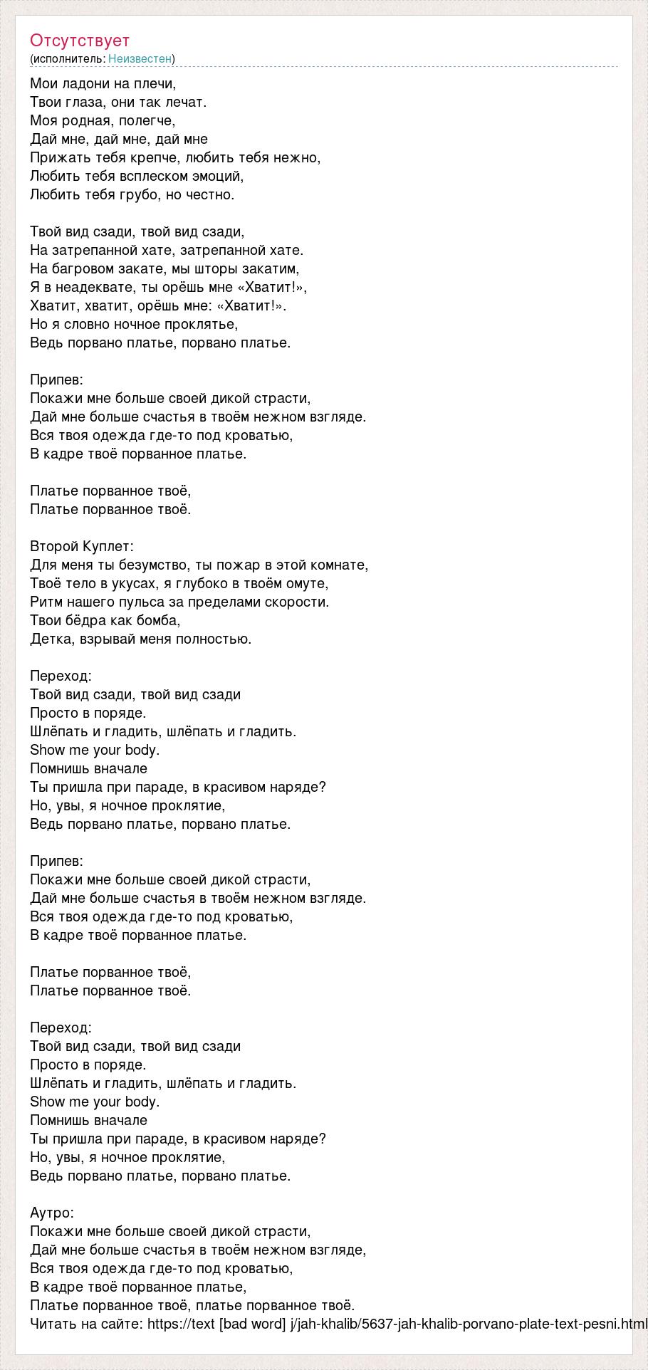 Мои ладони на плечи, Твои глаза, они так лечат. Моя родная, полегче, Дай мне, дай мне, дай мне Прижать тебя крепче, любить тебя нежно, Любить тебя всплеском эмоций, Любить тебя грубо, но честно. Твой вид сзади, твой вид сзади, На затрепанной хате, затрепанной хате. На багровом закате, мы шторы закатим, Я в неадеквате, ты орёшь мне «Хватит!», Хватит, хватит, орёшь мне: «Хватит!». Но я словно ночное проклятье, Ведь порвано платье, порвано платье. Припев: Покажи мне больше своей дикой страсти, Дай мне больше счастья в твоём нежном взгляде. Вся твоя одежда где-то под кроватью, В кадре твоё порванное платье. Платье порванное твоё, Платье порванное твоё. Второй Куплет: Для меня ты безумство, ты пожар в этой комнате, Твоё тело в укусах, я глубоко в твоём омуте, Ритм нашего пульса за пределами скорости. Твои бёдра как бомба, Детка, взрывай меня полностью. Переход: Твой вид сзади, твой вид сзади Просто в поряде. Шлёпать и гладить, шлёпать и гладить. Show me your body. Помнишь вначале Ты пришла при параде, в красивом наряде? Но, увы, я ночное проклятие, Ведь порвано платье, порвано платье. Припев: Покажи мне больше своей дикой страсти, Дай мне больше счастья в твоём нежном взгляде. Вся твоя одежда где-то под кроватью, В кадре твоё порванное платье. Платье порванное твоё, Платье порванное твоё. Переход: Твой вид сзади, твой вид сзади Просто в поряде. Шлёпать и гладить, шлёпать и гладить. Show me your body. Помнишь вначале Ты пришла при параде, в красивом наряде? Но, увы, я ночное проклятие, Ведь порвано платье, порвано платье. Аутро: Покажи мне больше своей дикой страсти, Дай мне больше счастья в твоём нежном взгляде, Вся твоя одежда где-то под кроватью, В кадре твоё порванное платье, Платье порванное твоё, платье порванное твоё. Читать на сайте: https://text [bad word] j/jah-khalib/5637-jah-khalib-porvano-plate-text-pesni.html