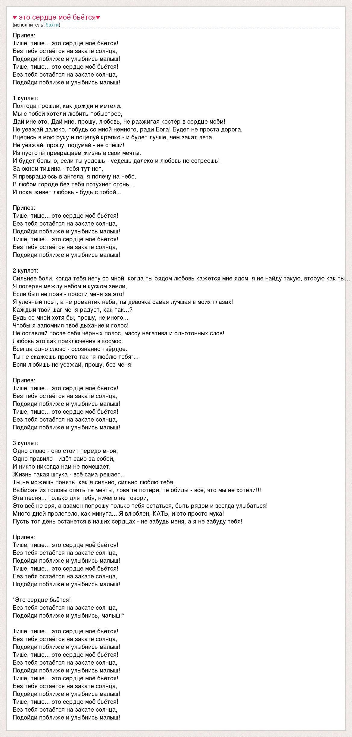 Припев: Тише, тише... это сердце моё бьётся! Без тебя остаётся на закате солнца, Подойди поближе и улыбнись малыш! Тише, тише... это сердце моё бьётся! Без тебя остаётся на закате солнца, Подойди поближе и улыбнись малыш! 1 куплет: Полгода прошли, как дожди и метели. Мы с тобой хотели любить побыстрее, Дай мне это. Дай мне, прошу, любовь, не разжигая костёр в сердце моём! Не уезжай далеко, побудь со мной немного, ради Бога! Будет не проста дорога. Вцепись в мою руку и поцелуй крепко - и будет лучше, чем закат лета. Не уезжай, прошу, подумай - не спеши! Из пустоты превращаем жизнь в свои мечты. И будет больно, если ты уедешь - уедешь далеко и любовь не согреешь! За окном тишина - тебя тут нет, Я превращаюсь в ангела, я полечу на небо. В любом городе без тебя потухнет огонь... И пока живет любовь - будь с тобой... Припев: Тише, тише... это сердце моё бьётся! Без тебя остаётся на закате солнца, Подойди поближе и улыбнись малыш! Тише, тише... это сердце моё бьётся! Без тебя остаётся на закате солнца, Подойди поближе и улыбнись малыш! 2 куплет: Сильнее боли, когда тебя нету со мной, когда ты рядом любовь кажется мне ядом, я не найду такую, вторую как ты... Я потерян между небом и куском земли, Если был не прав - прости меня за это! Я улечный поэт, а не романтик неба, ты девочка самая лучшая в моих глазах! Каждый твой шаг меня радует, как так...? Будь со мной хотя бы, прошу, не много... Чтобы я запомнил твоё дыхание и голос! Не оставляй после себя чёрных полос, массу негатива и однотонных слов! Любовь это как приключения в космос. Всегда одно слово - осознанно твёрдое. Ты не скажешь просто так "я люблю тебя"... Если любишь не уезжай, прошу, без меня! Припев: Тише, тише... это сердце моё бьётся! Без тебя остаётся на закате солнца, Подойди поближе и улыбнись малыш! Тише, тише... это сердце моё бьётся! Без тебя остаётся на закате солнца, Подойди поближе и улыбнись малыш! 3 куплет: Одно слово - оно стоит передо мной, Одно правило - идёт само за собой, И никто никогда нам не помешает, Жизнь такая штука - всё сама решает... Ты не можешь понять, как я сильно, сильно люблю тебя, Выбирая из головы опять те мечты, ловя те потери, те обиды - всё, что мы не хотели!!! Эта песня... только для тебя, ничего не говори, Это всё не зря, а взамен попрошу только тебя остаться, быть рядом и всегда улыбаться! Много дней пролетело, как минута... Я влюблен, КАТЬ, и это просто мука! Пусть тот день останется в наших сердцах - не забудь меня, а я не забуду тебя! Припев: Тише, тише... это сердце моё бьётся! Без тебя остаётся на закате солнца, Подойди поближе и улыбнись малыш! Тише, тише... это сердце моё бьётся! Без тебя остаётся на закате солнца, Подойди поближе и улыбнись малыш! *Это сердце бьётся! Без тебя остаётся на закате солнца, Подойди поближе и улыбнись, малыш!* Тише, тише... это сердце моё бьётся! Без тебя остаётся на закате солнца, Подойди поближе и улыбнись малыш! Тише, тише... это сердце моё бьётся! Без тебя остаётся на закате солнца, Подойди поближе и улыбнись малыш! Тише, тише... это сердце моё бьётся! Без тебя остаётся на закате солнца, Подойди поближе и улыбнись малыш! Тише, тише... это сердце моё бьётся! Без тебя остаётся на закате солнца, Подойди поближе и улыбнись малыш!