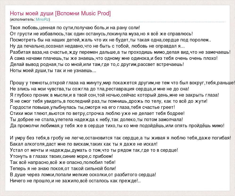 Твоя любовь,ценная по сути,получаю боль,и на рану соли! От грусти не избавлюсь,так один останусь,покинула муза,но я всё же справлюсь! Посмотреть бы на наших детей,жаль что их не будет,ты такая одна,сердце под поролем.. Ну да печально,осознал недавно,что не быть с тобой, любовь не оправдал я... Разбитая ваза,на счастье,жду перемен дальше,а ты проходишь мимо,делая вид,что не замечаешь! А сама начами плачешь,ты же знаешь,что одному мне одинока,и без тебя очень очень плохо! Делай вывод родная,ты со мной,или там,где то,с другим,рассвет встречаешь! Ноты моей души,ты так и не узнаешь... Прошу у темноты,открой глаза на минуту,мир покажется другим,не тем что был вокруг,тебя,раньше! Не злись на мои чувства,ты сожгла до тла,реставрация сердца,и мне не до сна! Я глубоко проник в мысли,и в твой сон,той ночью,сейчас который день,мне не закрыть глаза! Я не смог тебя увидеть,в последний раз,ты помнишь,дрожь по телу, как то всё до жути! Гордости повыше,улыбнулась ты,смотря на его глаза,тебя счастье греет! Стихи мои тлеют,вьются по ветру,строчка люблю уже не делает тебя бодрее! Ты добрее не стала,улетела надежда к небу,так долеко,ты потом замолчала! Да промолчи любимая,у тебя же в сердце тихо,ты ко мне подойдёшь,или опять пройдёшь мимо! И умру без тебя,в гробу не легче,остановится так сердце,а ты живая я люблю тебя,даже погибая! Бакал алкоголя,даст мне по вискам,таких как ты я даже не искал! Устал от мечты и надежды,думать о том,что ты рядом так,где то в сердце! Утонуть в глазах твоих,синие море,с прибоем! Так всё напрасно,всё же опасно,полюбил тебя! Теперь я не знаю покоя,от такой сильной боли! В душе через ломки,попали мелкие осколки,от разбитого сердца! Ничего не прошло,и не зажило,всё осталось как прежде!..