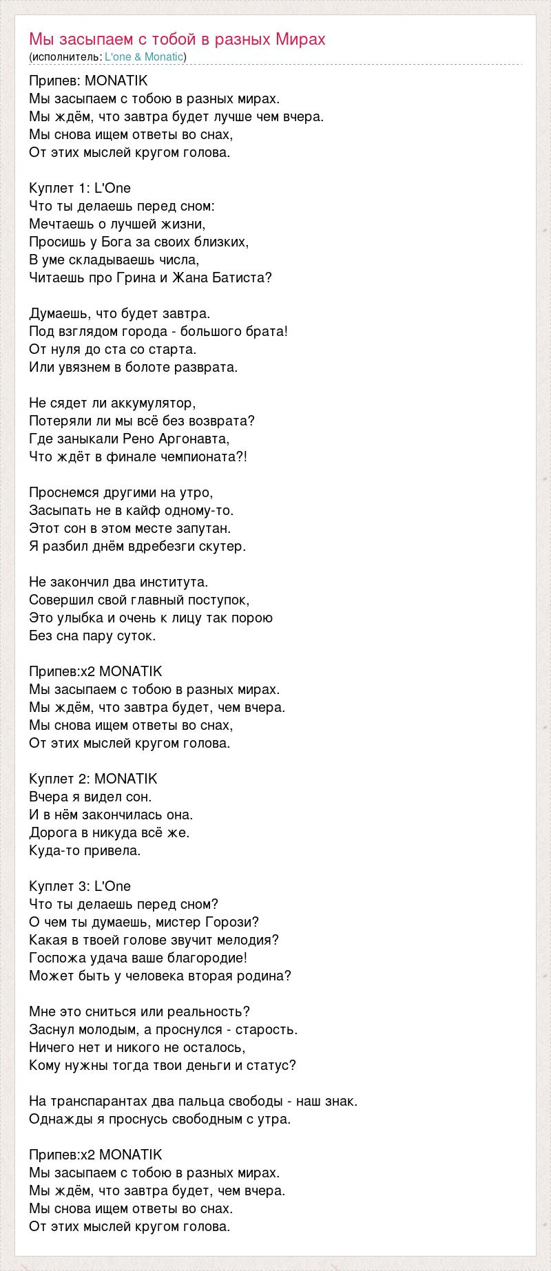 Припев: MONATIK Мы засыпаем с тобою в разных мирах. Мы ждём, что завтра будет лучше чем вчера. Мы снова ищем ответы во снах, От этих мыслей кругом голова. Куплет 1: L'One Что ты делаешь перед сном: Мечтаешь о лучшей жизни, Просишь у Бога за своих близких, В уме складываешь числа, Читаешь про Грина и Жана Батиста? Думаешь, что будет завтра. Под взглядом города - большого брата! От нуля до ста со старта. Или увязнем в болоте разврата. Не сядет ли аккумулятор, Потеряли ли мы всё без возврата? Где заныкали Рено Аргонавта, Что ждёт в финале чемпионата?! Проснемся другими на утро, Засыпать не в кайф одному-то. Этот сон в этом месте запутан. Я разбил днём вдребезги скутер. Не закончил два института. Совершил свой главный поступок, Это улыбка и очень к лицу так порою Без сна пару суток. Припев:х2 MONATIK Мы засыпаем с тобою в разных мирах. Мы ждём, что завтра будет, чем вчера. Мы снова ищем ответы во снах, От этих мыслей кругом голова. Куплет 2: MONATIK Вчера я видел сон. И в нём закончилась она. Дорога в никуда всё же. Куда-то привела. Куплет 3: L'One Что ты делаешь перед сном? О чем ты думаешь, мистер Горози? Какая в твоей голове звучит мелодия? Госпожа удача ваше благородие! Может быть у человека вторая родина? Мне это сниться или реальность? Заснул молодым, а проснулся - старость. Ничего нет и никого не осталось, Кому нужны тогда твои деньги и статус? На транспарантах два пальца свободы - наш знак. Однажды я проснусь свободным с утра. Припев:х2 MONATIK Мы засыпаем с тобою в разных мирах. Мы ждём, что завтра будет, чем вчера. Мы снова ищем ответы во снах. От этих мыслей кругом голова.