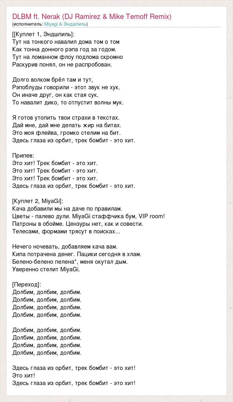 [[Куплет 1, Эндшпиль]: Тут на тонкого навалил дома том о том Как тонна донного рэпа год за годом. Тут на ломанном флоу подлома скромно Раскурив понял, он не распробован. Долго волком брёл там и тут, Рэпоблуды говорили - этот звук не хук. Он иначе друг, он как стая сук. То навалит дико, то отпустит волны мук. Я готов утопить твои страхи в текстах. Дай мне, дай мне делать жир на битах. Это моя флейва, громко стелим на бит. Здесь глаза из орбит, трек бомбит - это хит. Припев: Это хит! Трек бомбит - это хит. Это хит! Трек бомбит - это хит. Это хит! Трек бомбит - это хит. Здесь глаза из орбит, трек бомбит - это хит. [Куплет 2, MiyaGi]: Кача добавили мы на даче по правилам. Цветы - палево дули. MiyaGi стаффчика бум, VIP room! Патроны в обойме. Цензуры нет, как и совести. Телесами, формами трясут в поисках... Нечего ночевать, добавляем кача вам. Кипа потрачена денег. Пацики сегодня в хлам. Белено-белено пелена*, меня окутал дым. Уверенно стелит MiyaGi. [Переход]: Долбим, долбим, долбим. Долбим, долбим, долбим. Долбим, долбим, долбим. Долбим, долбим, долбим. Долбим, долбим, долбим. Долбим, долбим, долбим. Долбим, долбим, долбим. Долбим, долбим, долбим. Здесь глаза из орбит, трек бомбит - это хит! Это хит! Здесь глаза из орбит, трек бомбит - это хит!