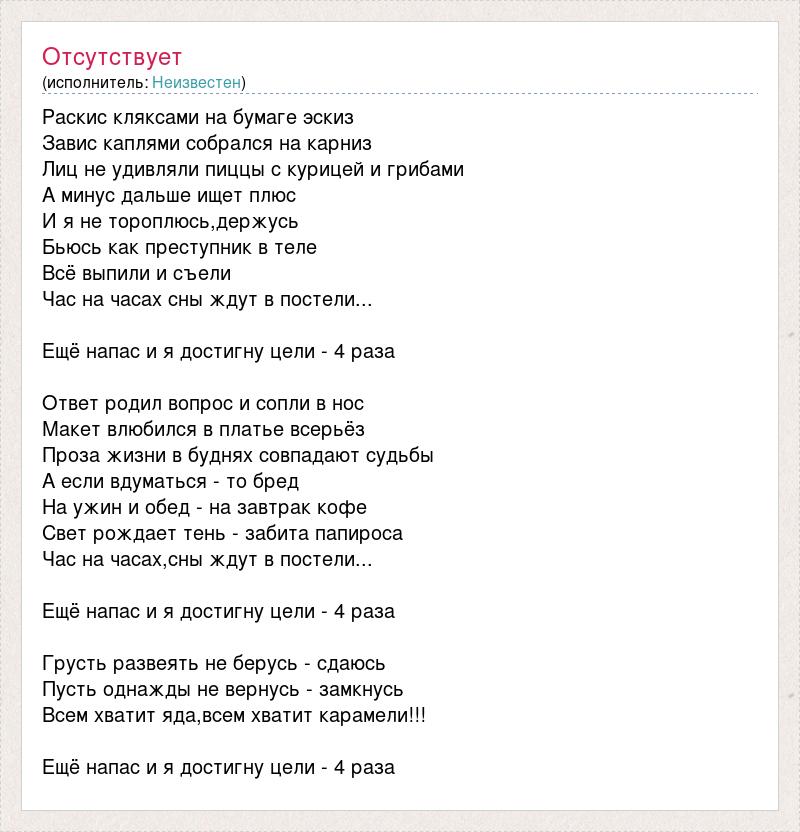 Раскис кляксами на бумаге эскиз Завис каплями собрался на карниз Лиц не удивляли пиццы с курицей и грибами А минус дальше ищет плюс И я не тороплюсь,держусь Бьюсь как преступник в теле Всё выпили и съели Час на часах сны ждут в постели... Ещё напас и я достигну цели - 4 раза Ответ родил вопрос и сопли в нос Макет влюбился в платье всерьёз Проза жизни в буднях совпадают судьбы А если вдуматься - то бред На ужин и обед - на завтрак кофе Свет рождает тень - забита папироса Час на часах,сны ждут в постели... Ещё напас и я достигну цели - 4 раза Грусть развеять не берусь - сдаюсь Пусть однажды не вернусь - замкнусь Всем хватит яда,всем хватит карамели!!! Ещё напас и я достигну цели - 4 раза
