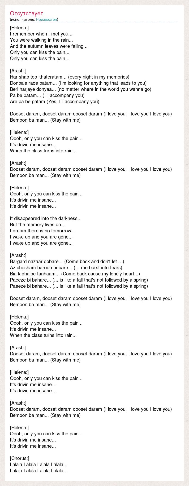 [Helena:] I remember when I met you... You were walking in the rain... And the autumn leaves were falling... Only you can kiss the pain... Only you can kiss the pain... [Arash:] Har shab too khateratam... (every night in my memories) Donbale rade patam... (I'm looking for anything that leads to you) Beri harjaye donyaa... (no matter where in the world you wanna go) Pa be patam... (I'll accompany you) Are pa be patam (Yes, I'll accompany you) Dooset daram, dooset daram dooset daram (I love you, I love you I love you) Bemoon ba man... (Stay with me) [Helena:] Oooh, only you can kiss the pain... It's drivin me insane... When the class turns into rain... [Arash:] Dooset daram, dooset daram dooset daram (I love you, I love you I love you) Bemoon ba man... (Stay with me) [Helena:] Oooh, only you can kiss the pain... It's drivin me insane... It's drivin me insane... It disappeared into the darkness... But the memory lives on... I dream there is no tomorrow... I wake up and you are gone... I wake up and you are gone... [Arash:] Bargard nazaar dobare... (Come back and don't let ...) Az chesham baroon bebare... (... me burst into tears) Bia k ghalbe tanhaam... (Come back cause my lonely heart...) Paeeze bi bahare... (... is like a fall that's not followed by a spring) Paeeze bi bahare... (... is like a fall that's not followed by a spring) Dooset daram, dooset daram dooset daram (I love you, I love you I love you) Bemoon ba man... (Stay with me) [Helena:] Oooh, only you can kiss the pain... It's drivin me insane... When the class turns into rain... [Arash:] Dooset daram, dooset daram dooset daram (I love you, I love you I love you) Bemoon ba man... (Stay with me) [Helena:] Oooh, only you can kiss the pain... It's drivin me insane... It's drivin me insane... [Arash:] Dooset daram, dooset daram dooset daram (I love you, I love you I love you) Bemoon ba man... (Stay with me) [Helena:] Oooh, only you can kiss the pain... It's drivin me insane... It's drivin me insane... [Chorus:] Lalala Lalala Lalala Lalala... Lalala Lalala Lalala Lalala...