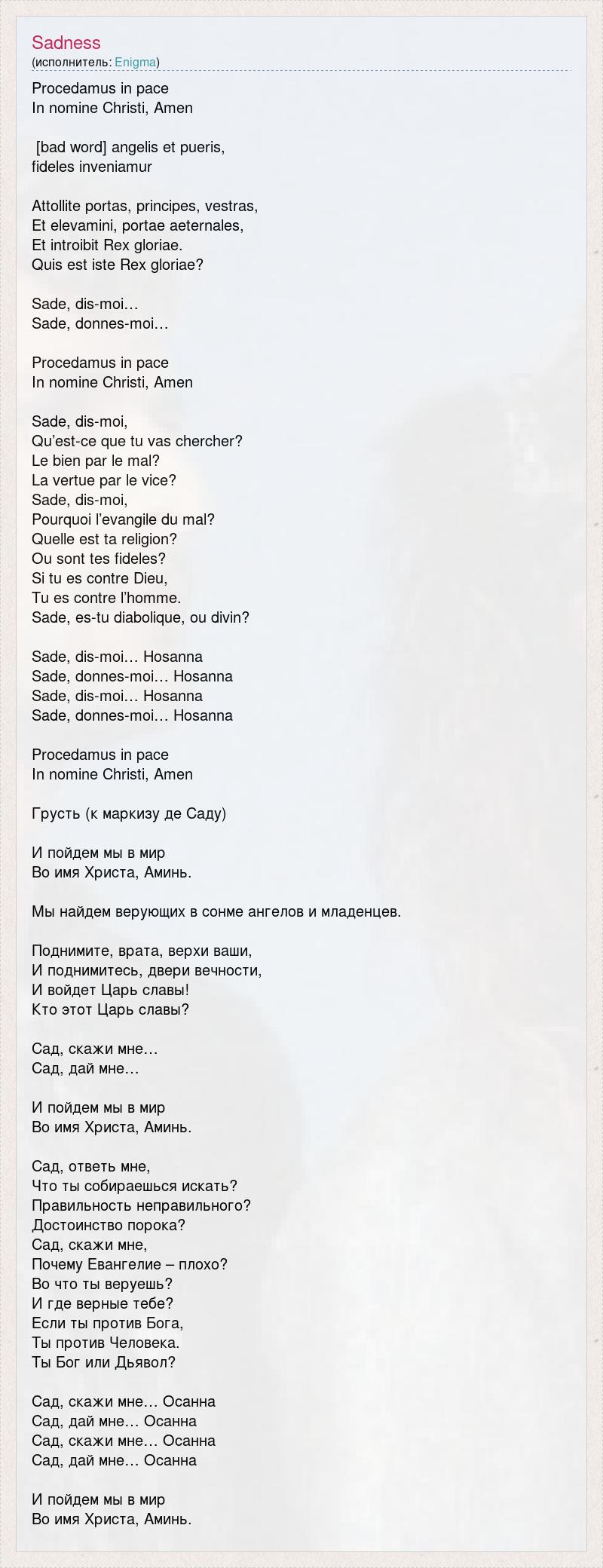 Procedamus in pace In nomine Christi, Amen [bad word] angelis et pueris, fideles inveniamur Attollite portas, principes, vestras, Et elevamini, portae aeternales, Et introibit Rex gloriae. Quis est iste Rex gloriae? Sade, dis-moi… Sade, donnes-moi… Procedamus in pace In nomine Christi, Amen Sade, dis-moi, Qu’est-ce que tu vas chercher? Le bien par le mal? La vertue par le vice? Sade, dis-moi, Pourquoi l’evangile du mal? Quelle est ta religion? Ou sont tes fideles? Si tu es contre Dieu, Tu es contre l’homme. Sade, es-tu diabolique, ou divin? Sade, dis-moi… Hosanna Sade, donnes-moi… Hosanna Sade, dis-moi… Hosanna Sade, donnes-moi… Hosanna Procedamus in pace In nomine Christi, Amen Грусть (к маркизу де Саду) И пойдем мы в мир Во имя Христа, Аминь. Мы найдем верующих в сонме ангелов и младенцев. Поднимите, врата, верхи ваши, И поднимитесь, двери вечности, И войдет Царь славы! Кто этот Царь славы? Сад, скажи мне… Сад, дай мне… И пойдем мы в мир Во имя Христа, Аминь. Сад, ответь мне, Что ты собираешься искать? Правильность неправильного? Достоинство порока? Сад, скажи мне, Почему Евангелие – плохо? Во что ты веруешь? И где верные тебе? Если ты против Бога, Ты против Человека. Ты Бог или Дьявол? Сад, скажи мне… Осанна Сад, дай мне… Осанна Сад, скажи мне… Осанна Сад, дай мне… Осанна И пойдем мы в мир Во имя Христа, Аминь.