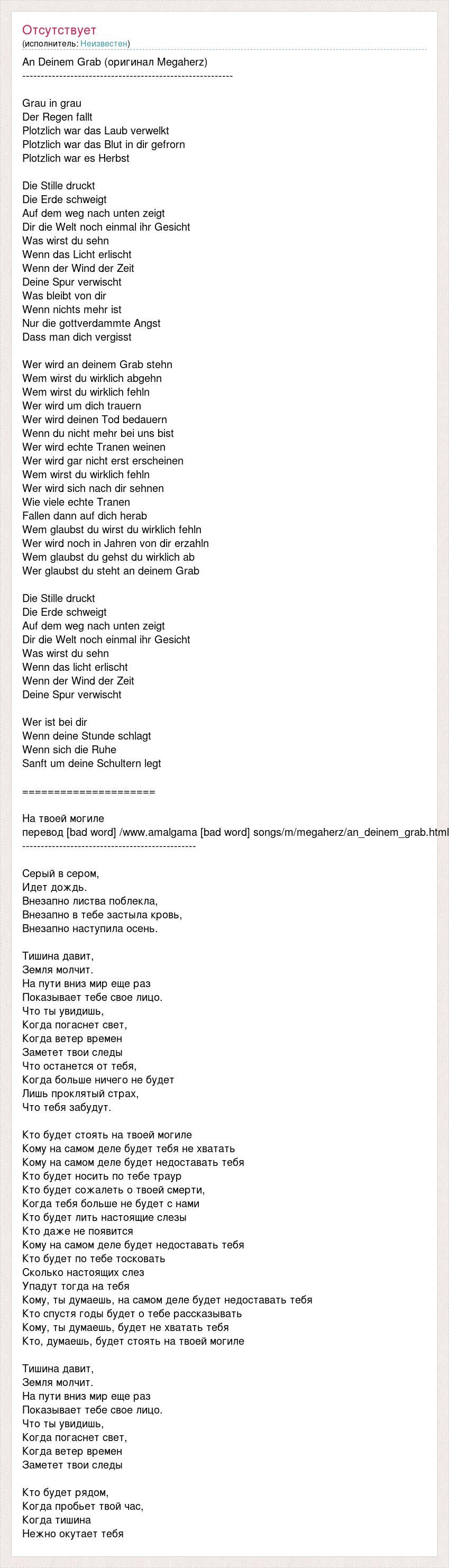 An Deinem Grab (оригинал Megaherz) --------------------------------------------------------- Grau in grau Der Regen fallt Plotzlich war das Laub verwelkt Plotzlich war das Blut in dir gefrorn Plotzlich war es Herbst Die Stille druckt Die Erde schweigt Auf dem weg nach unten zeigt Dir die Welt noch einmal ihr Gesicht Was wirst du sehn Wenn das Licht erlischt Wenn der Wind der Zeit Deine Spur verwischt Was bleibt von dir Wenn nichts mehr ist Nur die gottverdammte Angst Dass man dich vergisst Wer wird an deinem Grab stehn Wem wirst du wirklich abgehn Wem wirst du wirklich fehln Wer wird um dich trauern Wer wird deinen Tod bedauern Wenn du nicht mehr bei uns bist Wer wird echte Tranen weinen Wer wird gar nicht erst erscheinen Wem wirst du wirklich fehln Wer wird sich nach dir sehnen Wie viele echte Tranen Fallen dann auf dich herab Wem glaubst du wirst du wirklich fehln Wer wird noch in Jahren von dir erzahln Wem glaubst du gehst du wirklich ab Wer glaubst du steht an deinem Grab Die Stille druckt Die Erde schweigt Auf dem weg nach unten zeigt Dir die Welt noch einmal ihr Gesicht Was wirst du sehn Wenn das licht erlischt Wenn der Wind der Zeit Deine Spur verwischt Wer ist bei dir Wenn deine Stunde schlagt Wenn sich die Ruhe Sanft um deine Schultern legt ===================== На твоей могиле перевод [bad word] /www.amalgama [bad word] songs/m/megaherz/an_deinem_grab.html ----------------------------------------------- Серый в сером, Идет дождь. Внезапно листва поблекла, Внезапно в тебе застыла кровь, Внезапно наступила осень. Тишина давит, Земля молчит. На пути вниз мир еще раз Показывает тебе свое лицо. Что ты увидишь, Когда погаснет свет, Когда ветер времен Заметет твои следы Что останется от тебя, Когда больше ничего не будет Лишь проклятый страх, Что тебя забудут. Кто будет стоять на твоей могиле Кому на самом деле будет тебя не хватать Кому на самом деле будет недоставать тебя Кто будет носить по тебе траур Кто будет сожалеть о твоей смерти, Когда тебя больше не будет с нами Кто будет лить настоящие слезы Кто даже не появится Кому на самом деле будет недоставать тебя Кто будет по тебе тосковать Сколько настоящих слез Упадут тогда на тебя Кому, ты думаешь, на самом деле будет недоставать тебя Кто спустя годы будет о тебе рассказывать Кому, ты думаешь, будет не хватать тебя Кто, думаешь, будет стоять на твоей могиле Тишина давит, Земля молчит. На пути вниз мир еще раз Показывает тебе свое лицо. Что ты увидишь, Когда погаснет свет, Когда ветер времен Заметет твои следы Кто будет рядом, Когда пробьет твой час, Когда тишина Нежно окутает тебя