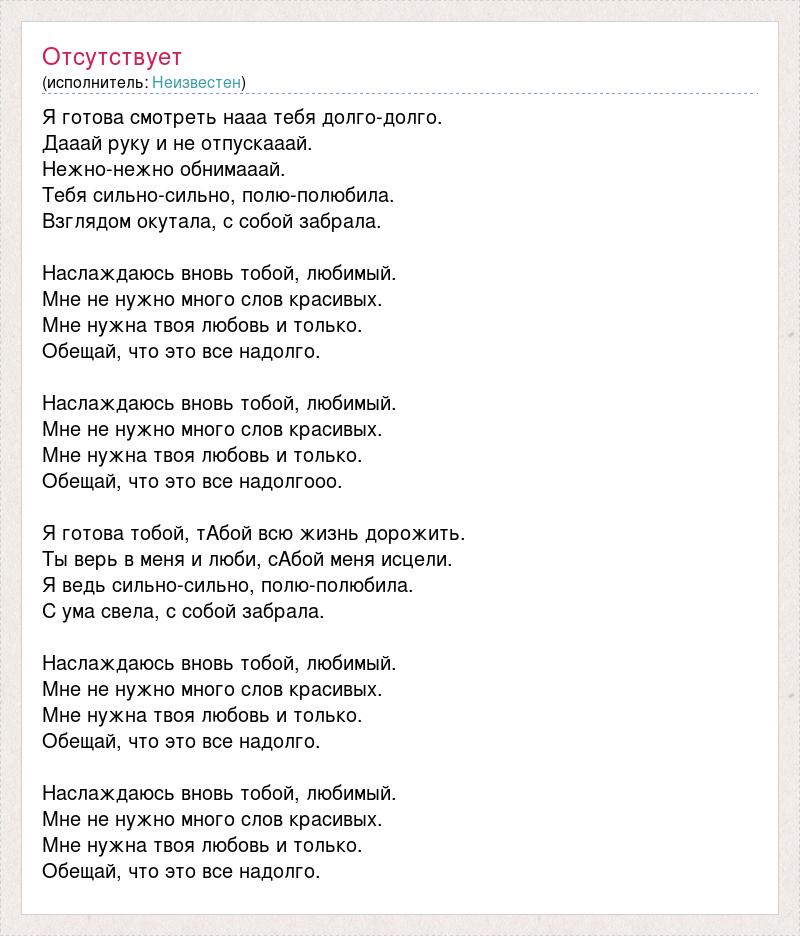 Я готова смотреть нааа тебя долго-долго. Дааай руку и не отпускааай. Нежно-нежно обнимааай. Тебя сильно-сильно, полю-полюбила. Взглядом окутала, с собой забрала. Наслаждаюсь вновь тобой, любимый. Мне не нужно много слов красивых. Мне нужна твоя любовь и только. Обещай, что это все надолго. Наслаждаюсь вновь тобой, любимый. Мне не нужно много слов красивых. Мне нужна твоя любовь и только. Обещай, что это все надолгооо. Я готова тобой, тАбой всю жизнь дорожить. Ты верь в меня и люби, сАбой меня исцели. Я ведь сильно-сильно, полю-полюбила. С ума свела, с собой забрала. Наслаждаюсь вновь тобой, любимый. Мне не нужно много слов красивых. Мне нужна твоя любовь и только. Обещай, что это все надолго. Наслаждаюсь вновь тобой, любимый. Мне не нужно много слов красивых. Мне нужна твоя любовь и только. Обещай, что это все надолго.