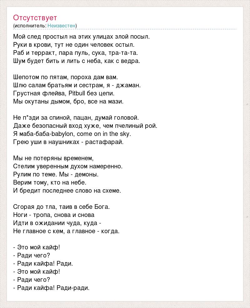 Мой след простыл на этих улицах злой посыл. Руки в крови, тут не один человек остыл. Раб и терракт, пара пуль, сука, тра-та-та. Шум будет бить и лить с неба, как с ведра. Шепотом по пятам, пороха дам вам. Шлю салам братьям и сестрам, я - джаман. Грустная флейва, Pitbull без цепи. Мы окутаны дымом, бро, все на мази. Не п*зди за спиной, пацан, думай головой. Даже безопасный вход хуже, чем пчелиный рой. Я маба-баба-babylon, come on in the sky. Грею уши в наушниках - растафарай. Мы не потеряны временем, Стелим уверенным духом намеренно. Рулим по теме. Мы - демоны. Верим тому, кто на небе. И бредит последнее слово на схеме. Сгорая до тла, таив в себе Бога. Ноги - тропа, снова и снова Идти в ожидании чуда, куда - Не главное с кем, а главное - когда. - Это мой кайф! - Ради чего? - Ради кайфа! Ради. - Это мой кайф! - Ради чего? - Ради кайфа! Ради-ради.