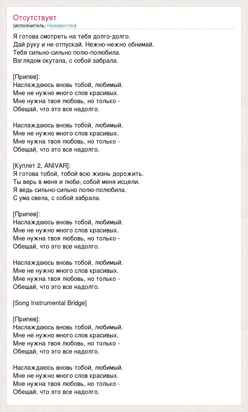 Я готова смотреть на тебя долго-долго. Дай руку и не отпускай. Нежно-нежно обнимай. Тебя сильно-сильно полю-полюбила. Взглядом окутала, с собой забрала. [Припев]: Наслаждаюсь вновь тобой, любимый. Мне не нужно много слов красивых. Мне нужна твоя любовь, но только - Обещай, что это все надолго. Наслаждаюсь вновь тобой, любимый. Мне не нужно много слов красивых. Мне нужна твоя любовь, но только - Обещай, что это все надолго. [Куплет 2, ANIVAR]: Я готова тобой, тобой всю жизнь дорожить. Ты верь в меня и люби, собой меня исцели. Я ведь сильно-сильно полю-полюбила. С ума свела, с собой забрала. [Припев]: Наслаждаюсь вновь тобой, любимый. Мне не нужно много слов красивых. Мне нужна твоя любовь, но только - Обещай, что это все надолго. Наслаждаюсь вновь тобой, любимый. Мне не нужно много слов красивых. Мне нужна твоя любовь, но только - Обещай, что это все надолго. [Song Instrumental Bridge] [Припев]: Наслаждаюсь вновь тобой, любимый. Мне не нужно много слов красивых. Мне нужна твоя любовь, но только - Обещай, что это все надолго. Наслаждаюсь вновь тобой, любимый. Мне не нужно много слов красивых. Мне нужна твоя любовь, но только - Обещай, что это все надолго.
