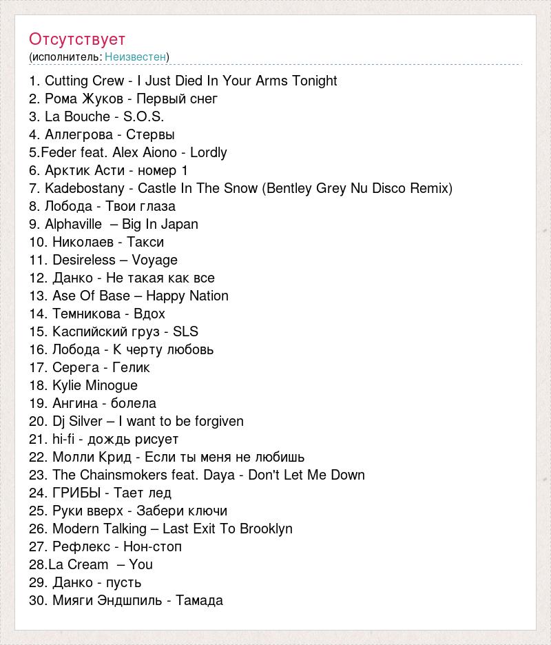 1. Cutting Crew - I Just Died In Your Arms Tonight 2. Рома Жуков - Первый снег 3. La Bouche - S.O.S. 4. Аллегрова - Стервы 5.Feder feat. Alex Aiono - Lordly 6. Арктик Асти - номер 1 7. Kadebostany - Castle In The Snow (Bentley Grey Nu Disco Remix) 8. Лобода - Твои глаза 9. Alphaville – Big In Japan 10. Николаев - Такси 11. Desireless – Voyage 12. Данко - Не такая как все 13. Ase Of Base – Happy Nation 14. Темникова - Вдох 15. Каспийский груз - SLS 16. Лобода - К черту любовь 17. Серега - Гелик 18. Kylie Minogue 19. Ангина - болела 20. Dj Silver – I want to be forgiven 21. hi-fi - дождь рисует 22. Молли Крид - Если ты меня не любишь 23. The Chainsmokers feat. Daya - Don't Let Me Down 24. ГРИБЫ - Тает лед 25. Руки вверх - Забери ключи 26. Modern Talking – Last Exit To Brooklyn 27. Рефлекс - Нон-стоп 28.La Cream – You 29. Данко - пусть 30. Мияги Эндшпиль - Тамада