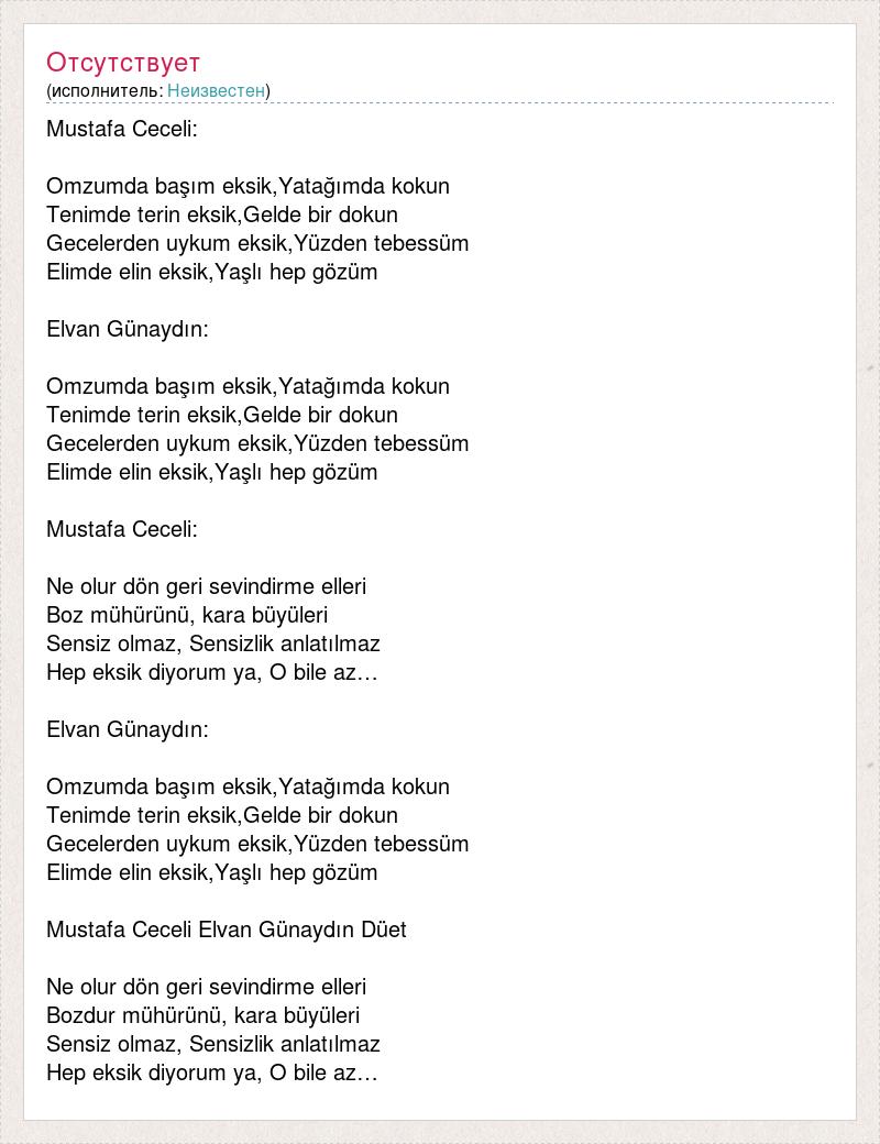 Mustafa Ceceli: Omzumda başım eksik,Yatağımda kokun Tenimde terin eksik,Gelde bir dokun Gecelerden uykum eksik,Yüzden tebessüm Elimde elin eksik,Yaşlı hep gözüm Elvan Günaydın: Omzumda başım eksik,Yatağımda kokun Tenimde terin eksik,Gelde bir dokun Gecelerden uykum eksik,Yüzden tebessüm Elimde elin eksik,Yaşlı hep gözüm Mustafa Ceceli: Ne olur dön geri sevindirme elleri Boz mühürünü, kara büyüleri Sensiz olmaz, Sensizlik anlatılmaz Hep eksik diyorum ya, O bile az… Elvan Günaydın: Omzumda başım eksik,Yatağımda kokun Tenimde terin eksik,Gelde bir dokun Gecelerden uykum eksik,Yüzden tebessüm Elimde elin eksik,Yaşlı hep gözüm Mustafa Ceceli Elvan Günaydın Düet Ne olur dön geri sevindirme elleri Bozdur mühürünü, kara büyüleri Sensiz olmaz, Sensizlik anlatılmaz Hep eksik diyorum ya, O bile az…