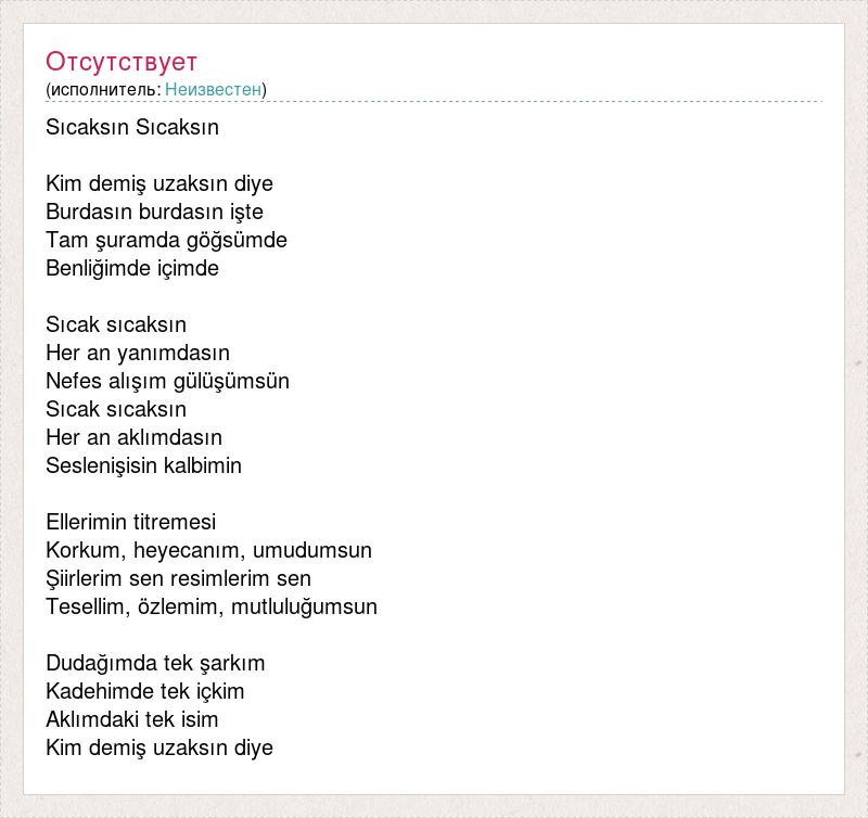 Sıcaksın Sıcaksın Kim demiş uzaksın diye Burdasın burdasın işte Tam şuramda göğsümde Benliğimde içimde Sıcak sıcaksın Her an yanımdasın Nefes alışım gülüşümsün Sıcak sıcaksın Her an aklımdasın Seslenişisin kalbimin Ellerimin titremesi Korkum, heyecanım, umudumsun Şiirlerim sen resimlerim sen Tesellim, özlemim, mutluluğumsun Dudağımda tek şarkım Kadehimde tek içkim Aklımdaki tek isim Kim demiş uzaksın diye