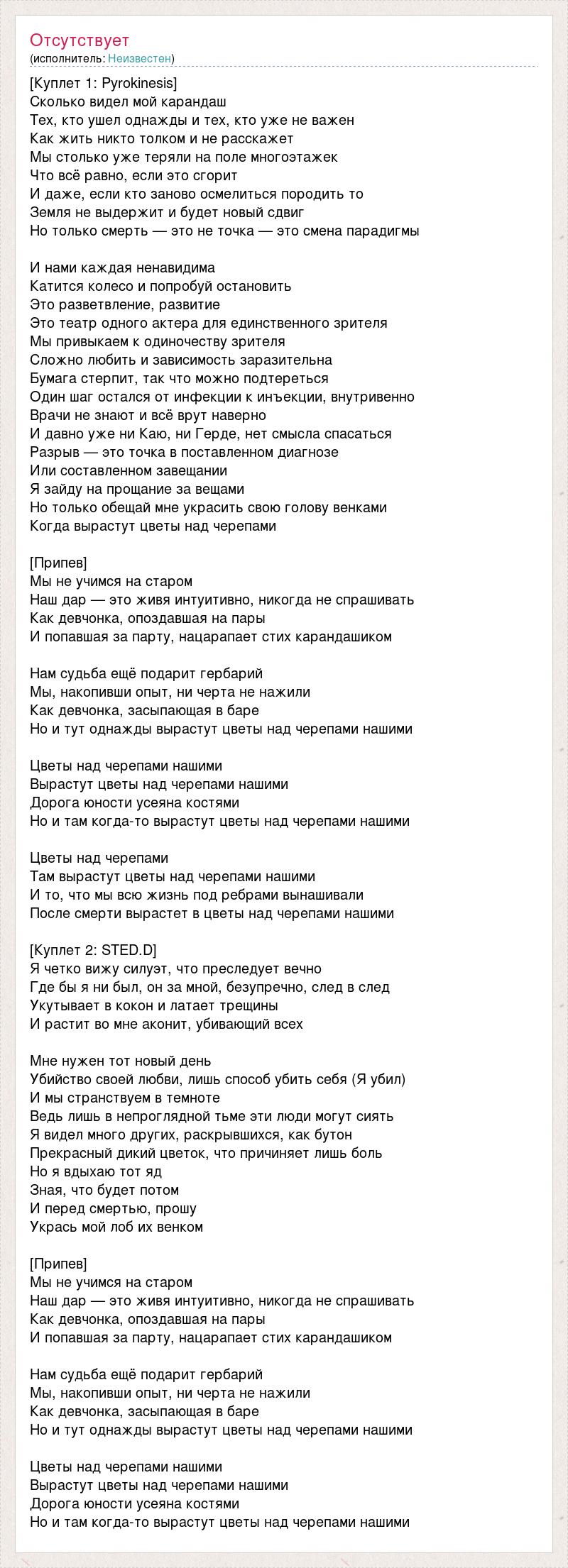 [Куплет 1: Pyrokinesis] Сколько видел мой карандаш Тех, кто ушел однажды и тех, кто уже не важен Как жить никто толком и не расскажет Мы столько уже теряли на поле многоэтажек Что всё равно, если это сгорит И даже, если кто заново осмелиться породить то Земля не выдержит и будет новый сдвиг Но только смерть — это не точка — это смена парадигмы И нами каждая ненавидима Катится колесо и попробуй остановить Это разветвление, развитие Это театр одного актера для единственного зрителя Мы привыкаем к одиночеству зрителя Сложно любить и зависимость заразительна Бумага стерпит, так что можно подтереться Один шаг остался от инфекции к инъекции, внутривенно Врачи не знают и всё врут наверно И давно уже ни Каю, ни Герде, нет смысла спасаться Разрыв — это точка в поставленном диагнозе Или составленном завещании Я зайду на прощание за вещами Но только обещай мне украсить свою голову венками Когда вырастут цветы над черепами [Припев] Мы не учимся на старом Наш дар — это живя интуитивно, никогда не спрашивать Как девчонка, опоздавшая на пары И попавшая за парту, нацарапает стих карандашиком Нам судьба ещё подарит гербарий Мы, накопивши опыт, ни черта не нажили Как девчонка, засыпающая в баре Но и тут однажды вырастут цветы над черепами нашими Цветы над черепами нашими Вырастут цветы над черепами нашими Дорога юности усеяна костями Но и там когда-то вырастут цветы над черепами нашими Цветы над черепами Там вырастут цветы над черепами нашими И то, что мы всю жизнь под ребрами вынашивали После смерти вырастет в цветы над черепами нашими [Куплет 2: STED.D] Я четко вижу силуэт, что преследует вечно Где бы я ни был, он за мной, безупречно, след в след Укутывает в кокон и латает трещины И растит во мне аконит, убивающий всех Мне нужен тот новый день Убийство своей любви, лишь способ убить себя (Я убил) И мы странствуем в темноте Ведь лишь в непроглядной тьме эти люди могут сиять Я видел много других, раскрывшихся, как бутон Прекрасный дикий цветок, что причиняет лишь боль Но я вдыхаю тот яд Зная, что будет потом И перед смертью, прошу Укрась мой лоб их венком [Припев] Мы не учимся на старом Наш дар — это живя интуитивно, никогда не спрашивать Как девчонка, опоздавшая на пары И попавшая за парту, нацарапает стих карандашиком Нам судьба ещё подарит гербарий Мы, накопивши опыт, ни черта не нажили Как девчонка, засыпающая в баре Но и тут однажды вырастут цветы над черепами нашими Цветы над черепами нашими Вырастут цветы над черепами нашими Дорога юности усеяна костями Но и там когда-то вырастут цветы над черепами нашими