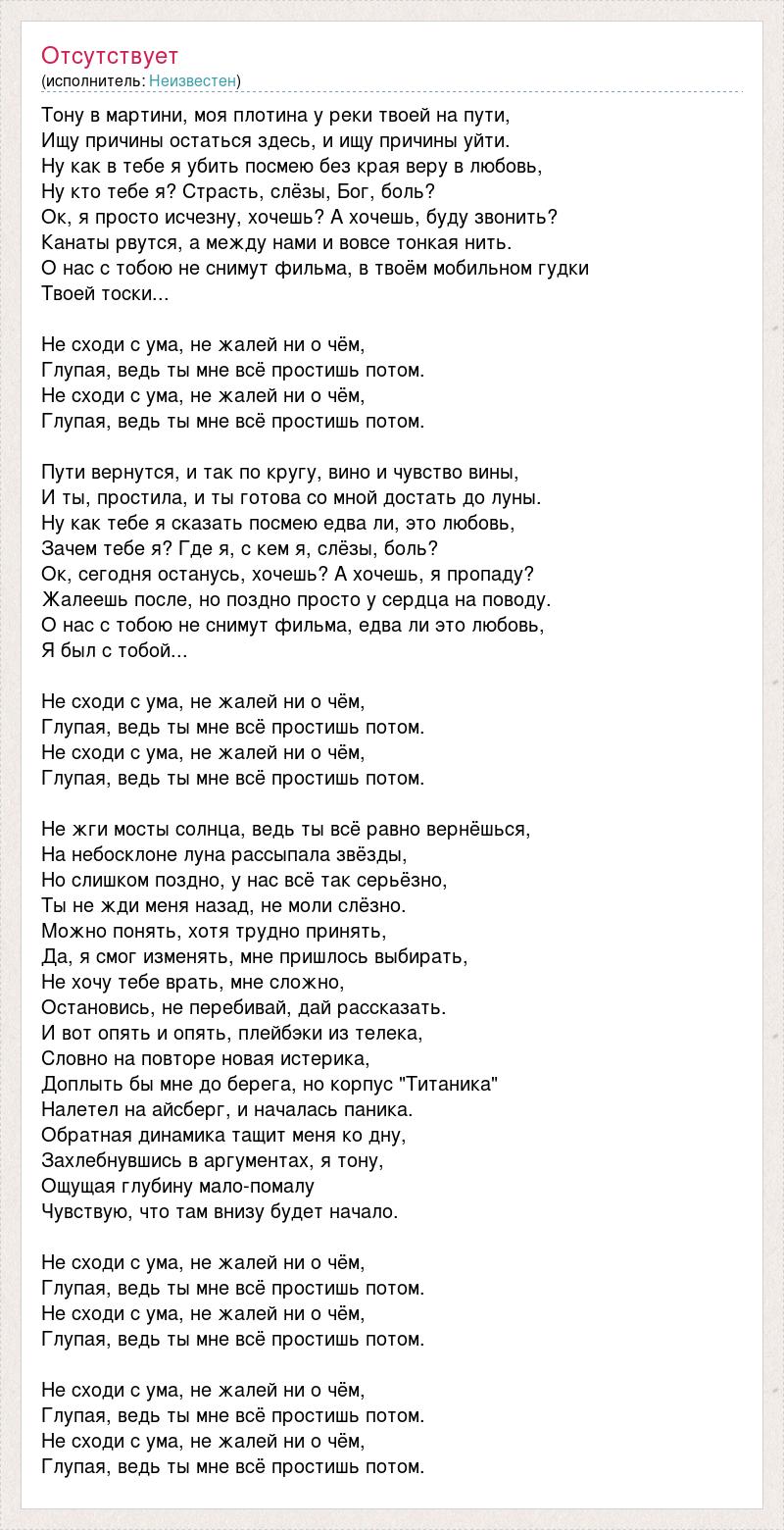 Тону в мартини, моя плотина у реки твоей на пути, Ищу причины остаться здесь, и ищу причины уйти. Ну как в тебе я убить посмею без края веру в любовь, Ну кто тебе я? Страсть, слёзы, Бог, боль? Ок, я просто исчезну, хочешь? А хочешь, буду звонить? Канаты рвутся, а между нами и вовсе тонкая нить. О нас с тобою не снимут фильма, в твоём мобильном гудки Твоей тоски... Не сходи с ума, не жалей ни о чём, Глупая, ведь ты мне всё простишь потом. Не сходи с ума, не жалей ни о чём, Глупая, ведь ты мне всё простишь потом. Пути вернутся, и так по кругу, вино и чувство вины, И ты, простила, и ты готова со мной достать до луны. Ну как тебе я сказать посмею едва ли, это любовь, Зачем тебе я? Где я, с кем я, слёзы, боль? Ок, сегодня останусь, хочешь? А хочешь, я пропаду? Жалеешь после, но поздно просто у сердца на поводу. О нас с тобою не снимут фильма, едва ли это любовь, Я был с тобой... Не сходи с ума, не жалей ни о чём, Глупая, ведь ты мне всё простишь потом. Не сходи с ума, не жалей ни о чём, Глупая, ведь ты мне всё простишь потом. Не жги мосты солнца, ведь ты всё равно вернёшься, На небосклоне луна рассыпала звёзды, Но слишком поздно, у нас всё так серьёзно, Ты не жди меня назад, не моли слёзно. Можно понять, хотя трудно принять, Да, я смог изменять, мне пришлось выбирать, Не хочу тебе врать, мне сложно, Остановись, не перебивай, дай рассказать. И вот опять и опять, плейбэки из телека, Словно на повторе новая истерика, Доплыть бы мне до берега, но корпус "Титаника" Налетел на айсберг, и началась паника. Обратная динамика тащит меня ко дну, Захлебнувшись в аргументах, я тону, Ощущая глубину мало-помалу Чувствую, что там внизу будет начало. Не сходи с ума, не жалей ни о чём, Глупая, ведь ты мне всё простишь потом. Не сходи с ума, не жалей ни о чём, Глупая, ведь ты мне всё простишь потом. Не сходи с ума, не жалей ни о чём, Глупая, ведь ты мне всё простишь потом. Не сходи с ума, не жалей ни о чём, Глупая, ведь ты мне всё простишь потом.
