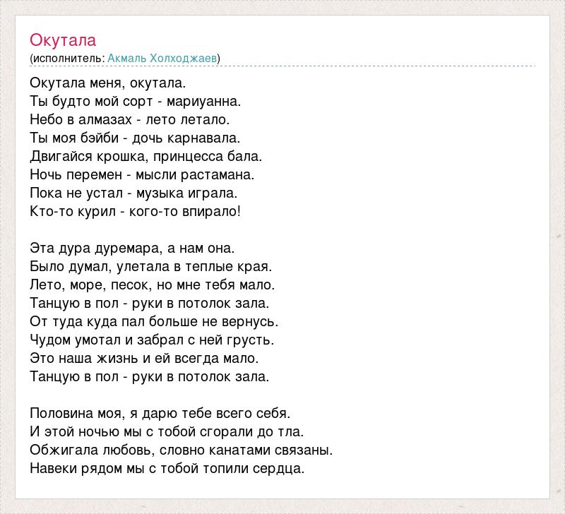 Окутала меня, окутала. Ты будто мой сорт - мариуанна. Небо в алмазах - лето летало. Ты моя бэйби - дочь карнавала. Двигайся крошка, принцесса бала. Ночь перемен - мысли растамана. Пока не устал - музыка играла. Кто-то курил - кого-то впирало! Эта дура дуремара, а нам она. Было думал, улетала в теплые края. Лето, море, песок, но мне тебя мало. Танцую в пол - руки в потолок зала. От туда куда пал больше не вернусь. Чудом умотал и забрал с ней грусть. Это наша жизнь и ей всегда мало. Танцую в пол - руки в потолок зала. Половина моя, я дарю тебе всего себя. И этой ночью мы с тобой сгорали до тла. Обжигала любовь, словно канатами связаны. Навеки рядом мы с тобой топили сердца.
