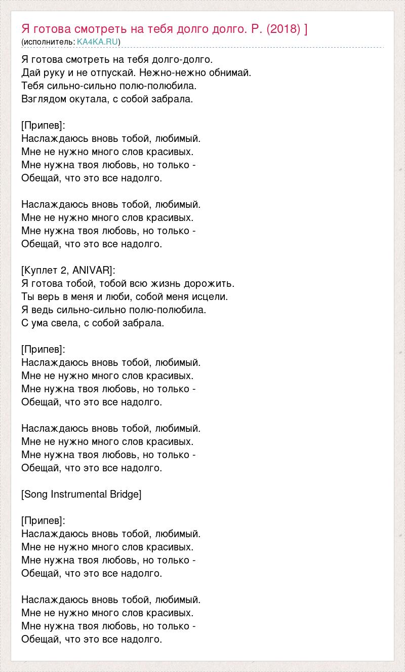Я готова смотреть на тебя долго-долго. Дай руку и не отпускай. Нежно-нежно обнимай. Тебя сильно-сильно полю-полюбила. Взглядом окутала, с собой забрала. [Припев]: Наслаждаюсь вновь тобой, любимый. Мне не нужно много слов красивых. Мне нужна твоя любовь, но только - Обещай, что это все надолго. Наслаждаюсь вновь тобой, любимый. Мне не нужно много слов красивых. Мне нужна твоя любовь, но только - Обещай, что это все надолго. [Куплет 2, ANIVAR]: Я готова тобой, тобой всю жизнь дорожить. Ты верь в меня и люби, собой меня исцели. Я ведь сильно-сильно полю-полюбила. С ума свела, с собой забрала. [Припев]: Наслаждаюсь вновь тобой, любимый. Мне не нужно много слов красивых. Мне нужна твоя любовь, но только - Обещай, что это все надолго. Наслаждаюсь вновь тобой, любимый. Мне не нужно много слов красивых. Мне нужна твоя любовь, но только - Обещай, что это все надолго. [Song Instrumental Bridge] [Припев]: Наслаждаюсь вновь тобой, любимый. Мне не нужно много слов красивых. Мне нужна твоя любовь, но только - Обещай, что это все надолго. Наслаждаюсь вновь тобой, любимый. Мне не нужно много слов красивых. Мне нужна твоя любовь, но только - Обещай, что это все надолго.