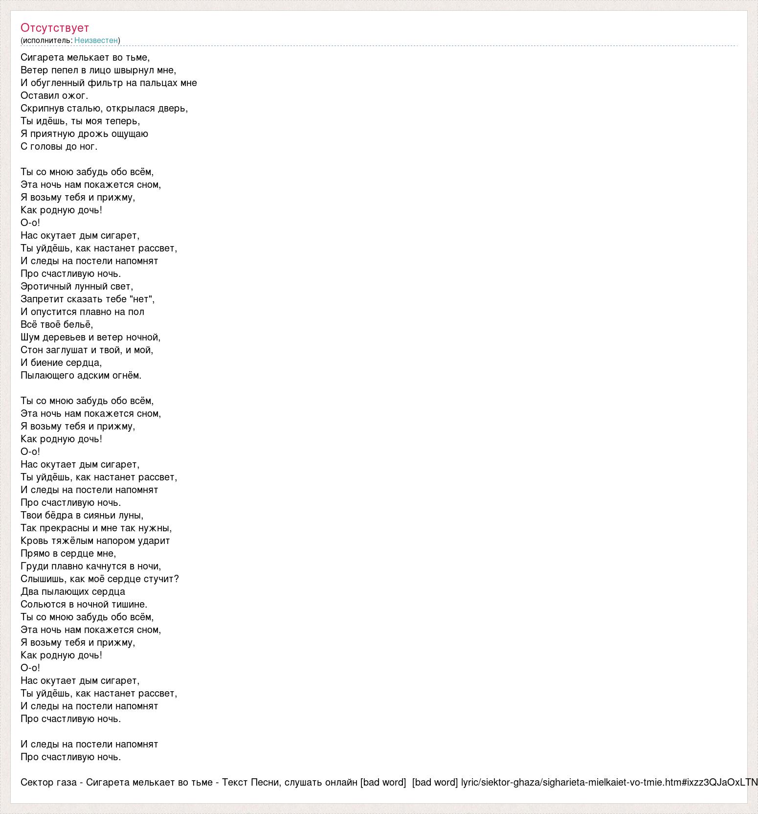 Сигарета мелькает во тьме, Ветер пепел в лицо швырнул мне, И обугленный фильтр на пальцах мне Оставил ожог. Скрипнув сталью, открылася дверь, Ты идёшь, ты моя теперь, Я приятную дрожь ощущаю С головы до ног. Ты со мною забудь обо всём, Эта ночь нам покажется сном, Я возьму тебя и прижму, Как родную дочь! О-о! Hас окутает дым сигарет, Ты уйдёшь, как настанет рассвет, И следы на постели напомнят Про счастливую ночь. Эротичный лунный свет, Запретит сказать тебе "нет", И опустится плавно на пол Всё твоё бельё, Шум деревьев и ветер ночной, Стон заглушат и твой, и мой, И биение сердца, Пылающего адским огнём. Ты со мною забудь обо всём, Эта ночь нам покажется сном, Я возьму тебя и прижму, Как родную дочь! О-о! Hас окутает дым сигарет, Ты уйдёшь, как настанет рассвет, И следы на постели напомнят Про счастливую ночь. Твои бёдра в сияньи луны, Так прекрасны и мне так нужны, Кровь тяжёлым напором ударит Прямо в сердце мне, Груди плавно качнутся в ночи, Слышишь, как моё сердце стучит? Два пылающих сердца Сольются в ночной тишине. Ты со мною забудь обо всём, Эта ночь нам покажется сном, Я возьму тебя и прижму, Как родную дочь! О-о! Hас окутает дым сигарет, Ты уйдёшь, как настанет рассвет, И следы на постели напомнят Про счастливую ночь. И следы на постели напомнят Про счастливую ночь. Сектор газа - Сигарета мелькает во тьме - Текст Песни, слушать онлайн [bad word] [bad word] lyric/siektor-ghaza/sigharieta-mielkaiet-vo-tmie.htm#ixzz3QJaOxLTN